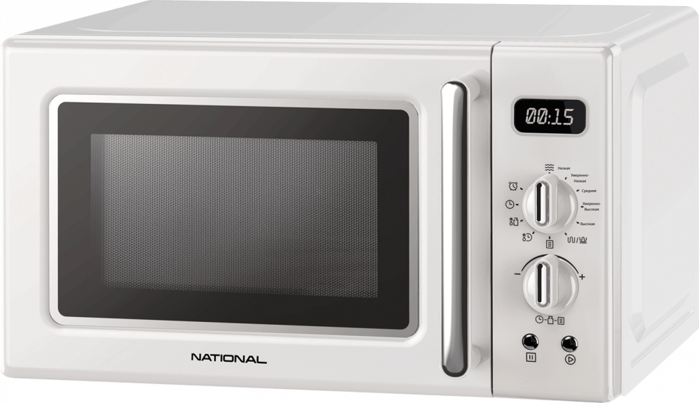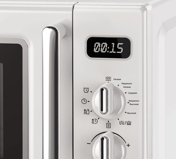 отдельно стоящая микроволновая печь, объем 20 л, мощность 700 Вт, электронное управление, тактовые и кнопочные переключатели, дисплей, защита от детей