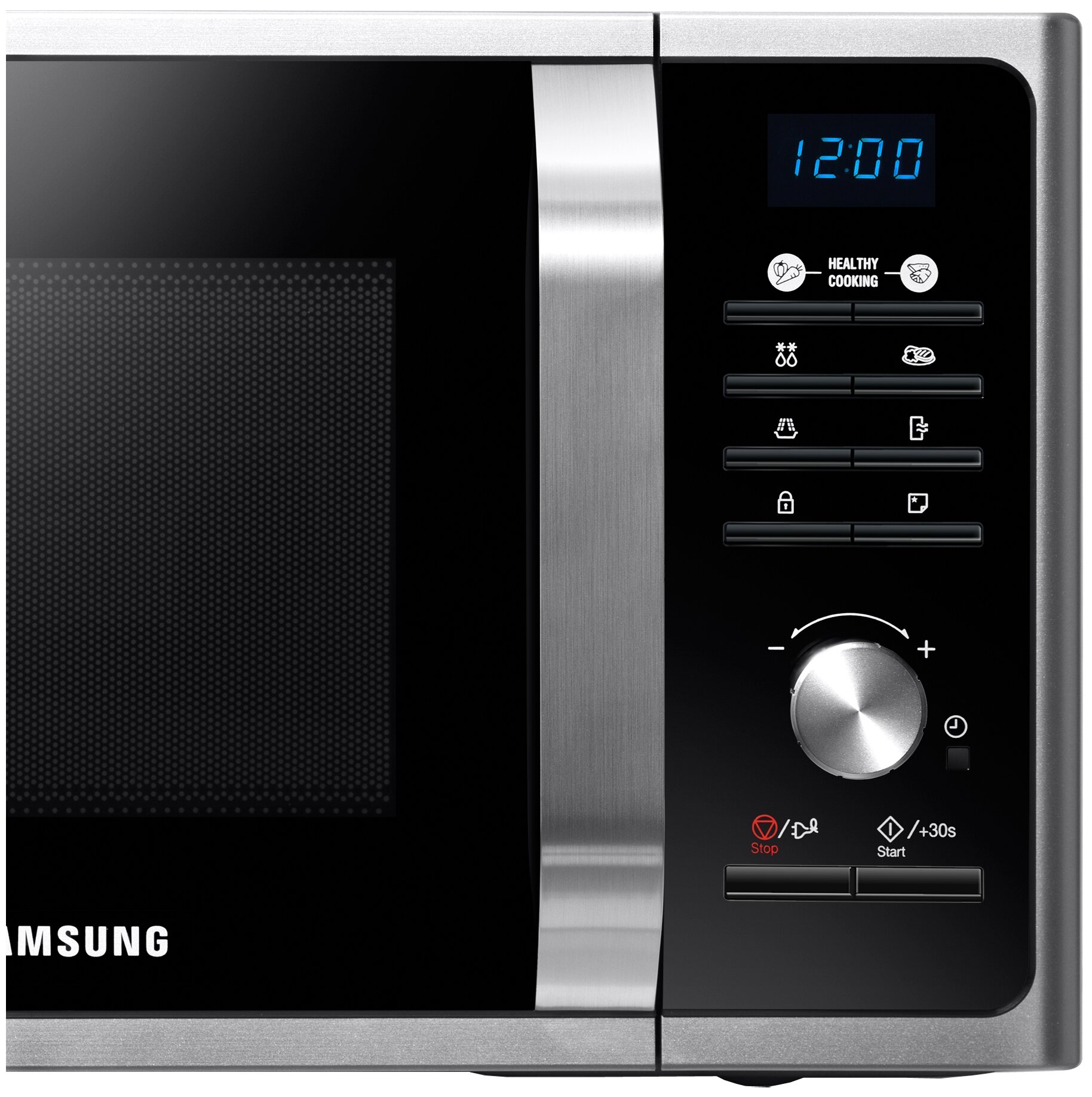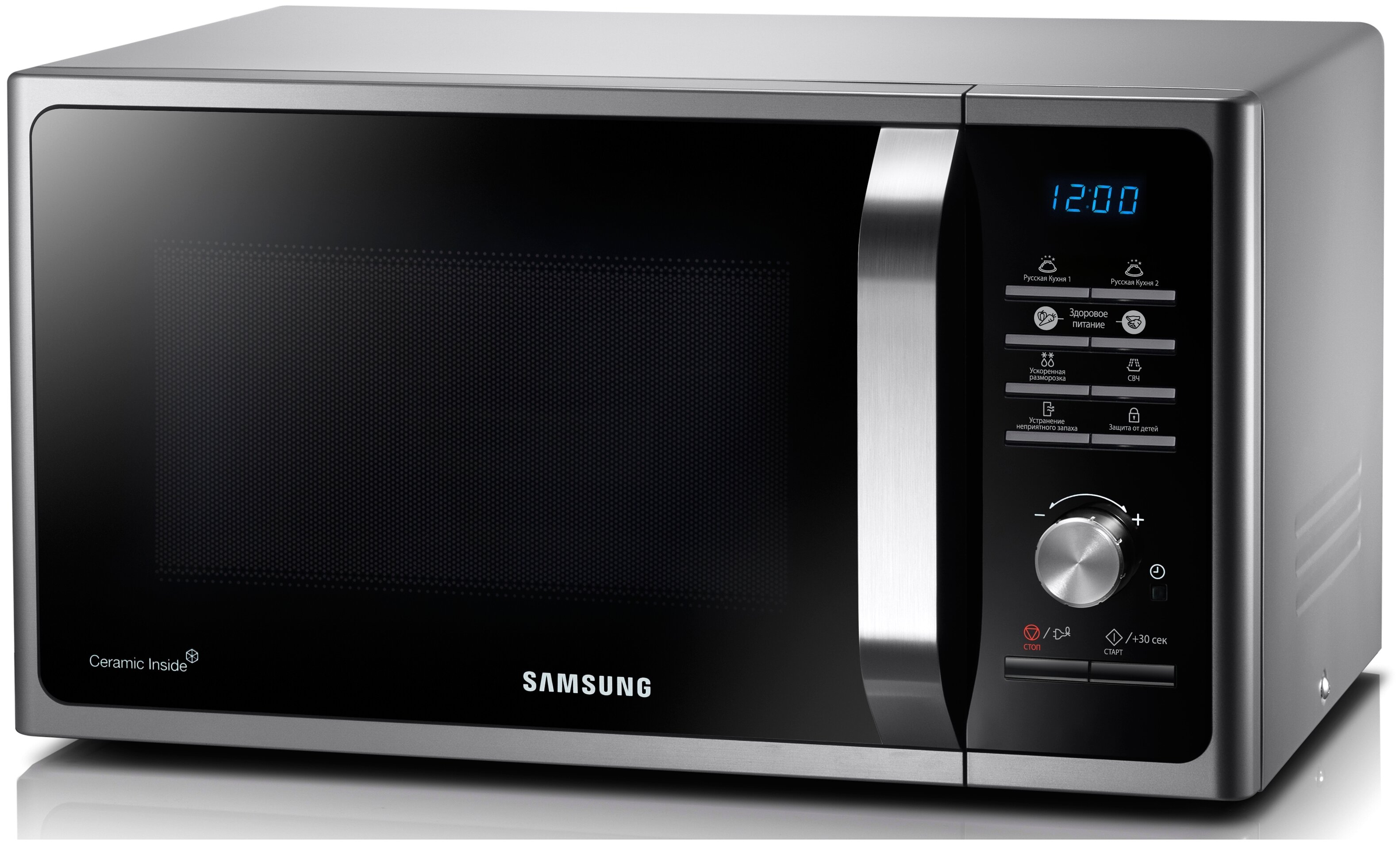 дисплей, подсветка камеры, блокировка от детей, система равномерного распределения микроволн, утапливаемые переключатели, кнопка +30 секунд