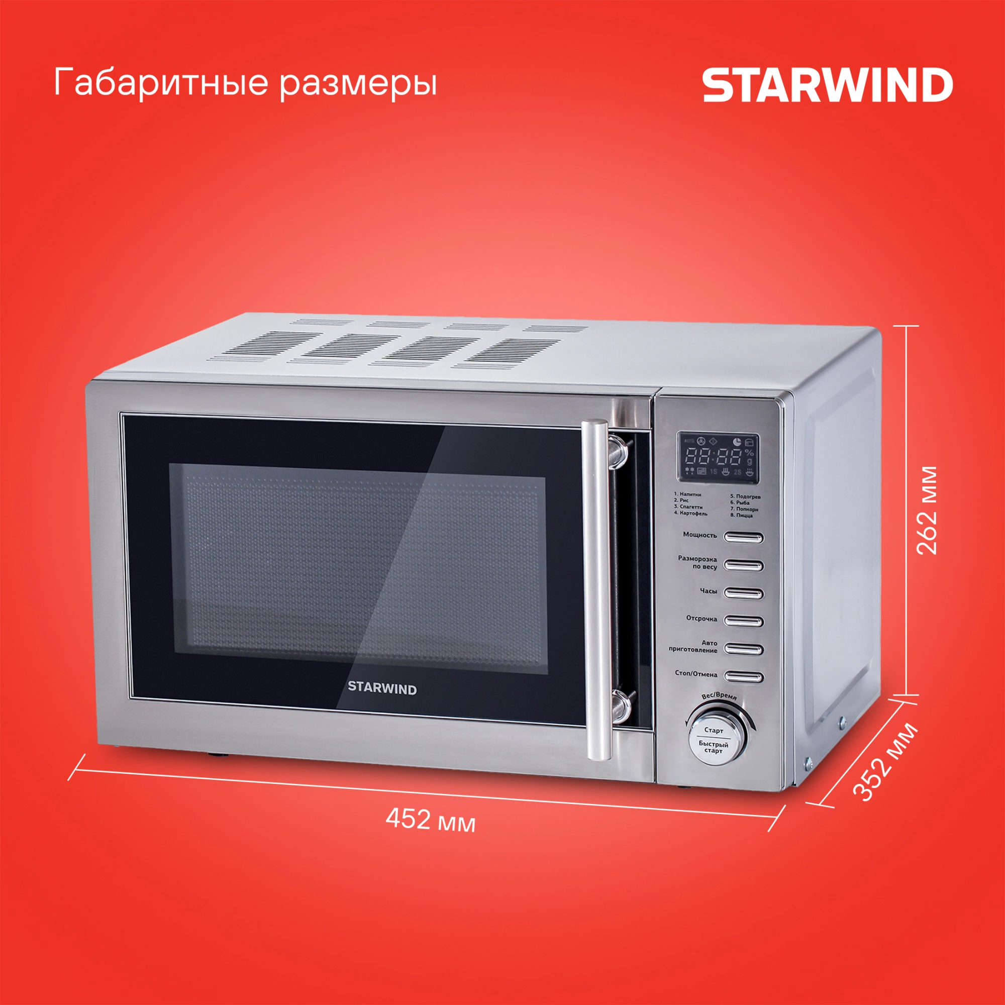 Микроволновая печь STARWIND SMW5320 выполнена в стильном современном дизайне. Корпус серого цвета в сочетании с элементами управления в серебристом цвете позволят идеально вписаться в дизайн любой кухни. Панель управления расположена в правой части прибора. Вверху находится обширная перфорация для вывода горячего воздуха во время работы печи. В нижней части предусмотрены 4 ножки, защищающие поверхность, на которую устанавливается прибор, от повреждений.