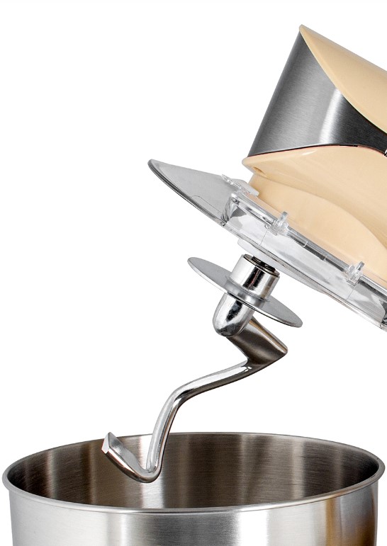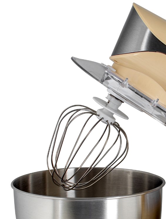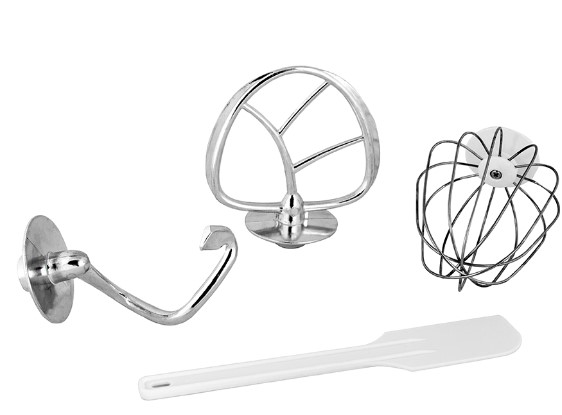 В комплект входят: крюк для теста, лопасть для смешивания, венчик для взбивания, лопатка