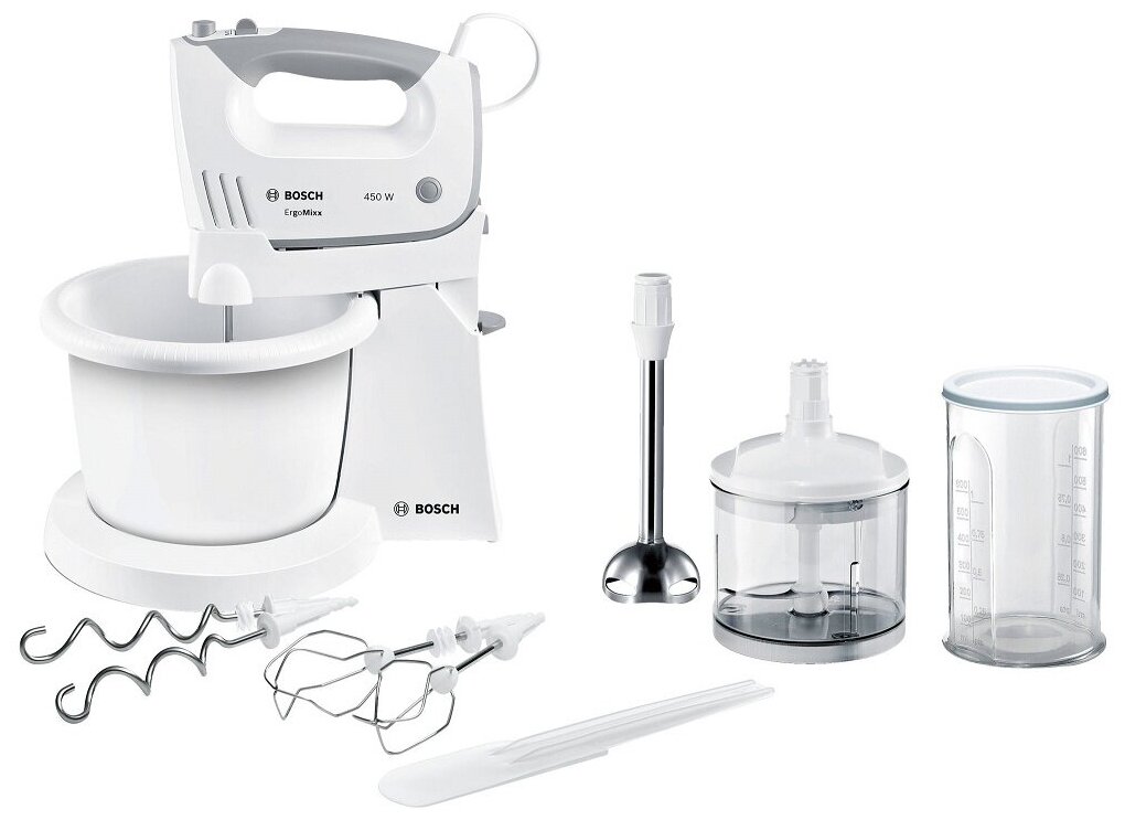 измельчитель, кулинарная лопатка, мерный стакан, насадка-венчик (2 шт.), насадка-крюк (2 шт.), чаша