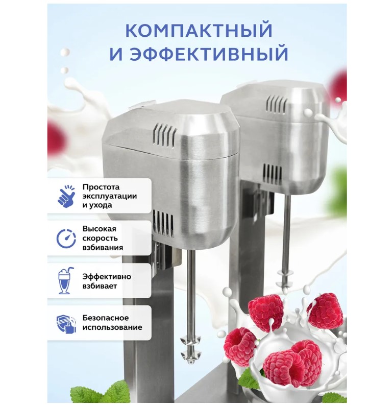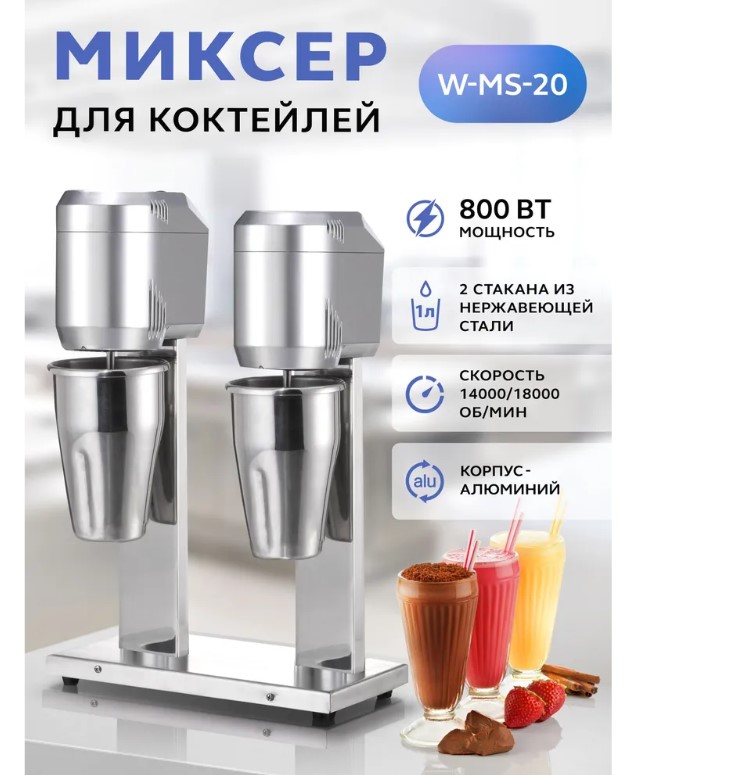 Двухрожковый миксер для молочных коктейлей Gastrorag W-MS-20 - это профессиональное оборудование для приготовления напитков в ресторанах, кафе, барах, которое также может быть использовано как техника для домашней кухни. Милкшейкер рассчитан на длительную непрерывную работу (до 9 часов) и предназначен для профессионалов коктейльного бизнеса. Барный миксер оснащен алюминиевым корпусом с массивным основанием на резиновых ножках-присосках, которые обеспечивают устойчивость и безопасность в эксплуатации. Устройство имеет две рабочих головки, что повышает пропускную способность и дает возможность одновременно готовить коктейли по разным рецептурам, с разными ингредиентами. Каждая рабочая головка имеет двухскоростной двигатель и простое электромеханическое управление с переключателем скоростей, расположенным в верхней части. На несъемном шпинделе крепится съемная насадка для взбивания из нержавеющей стали с двумя волнистыми дисками. В комплект также входит запасная насадка с крепежом. Благодаря мощному двигателю и высокой скорости вращения насадки (14000/18000 оборотов в минуту) молочная смесь быстро и равномерно взбивается по всему объему стакана. Время приготовления классического коктейля из молока, пломбира и сиропа - 45 секунд. Два стакана емкостью 1 л из нержавеющей стали позволяют одновременно приготовить 4-6 порций напитков.