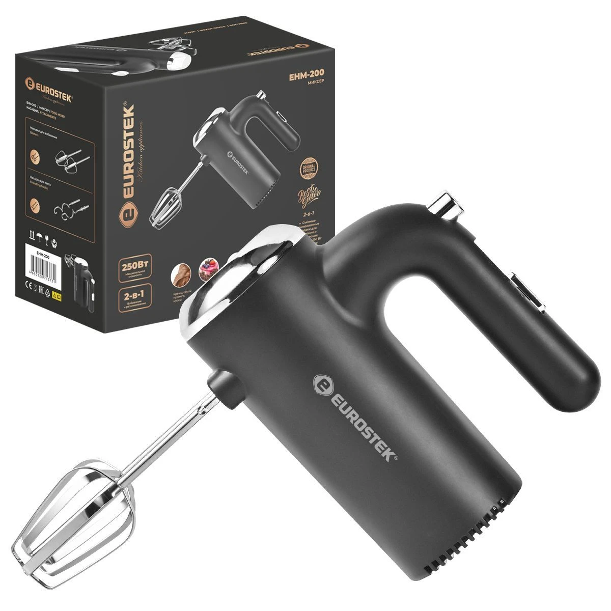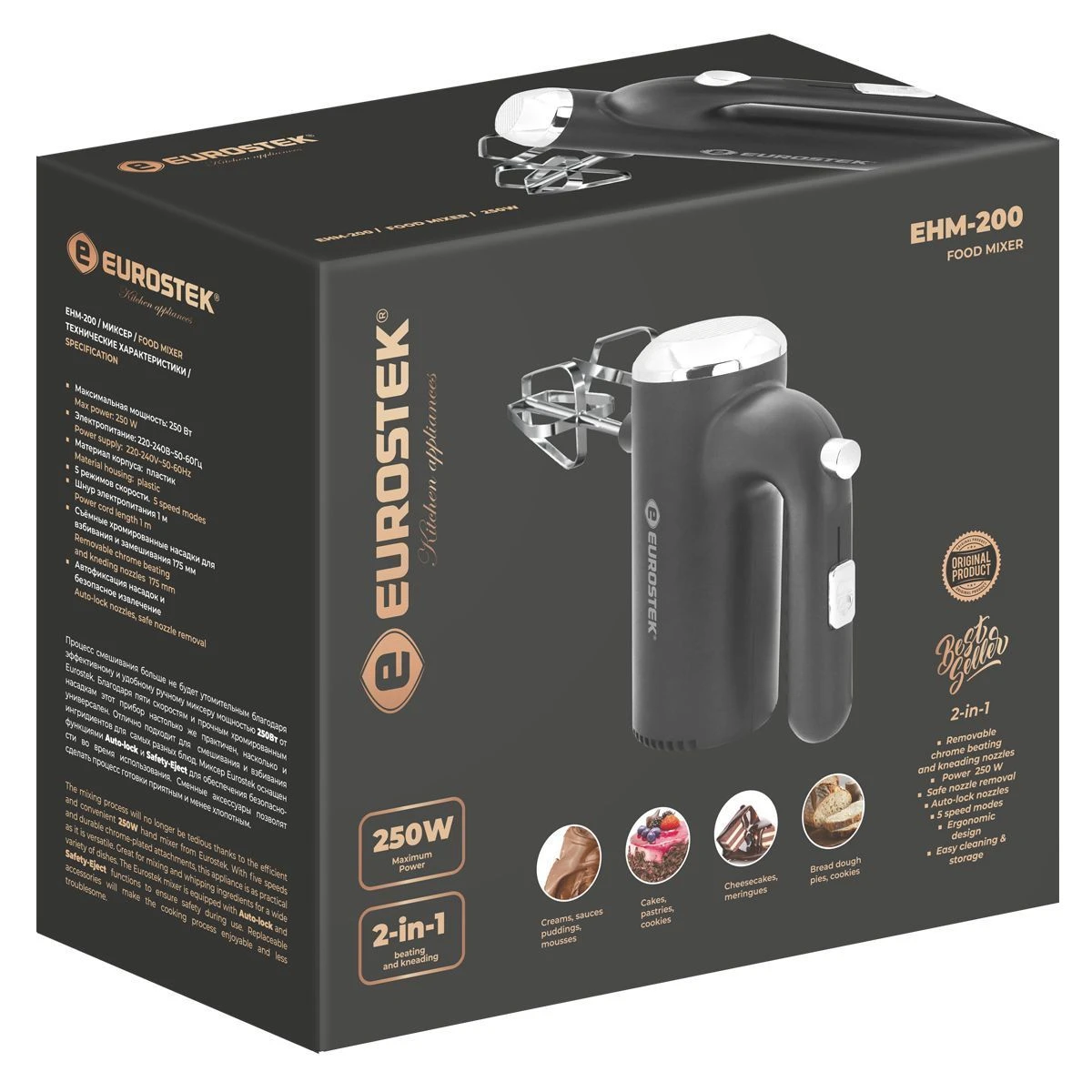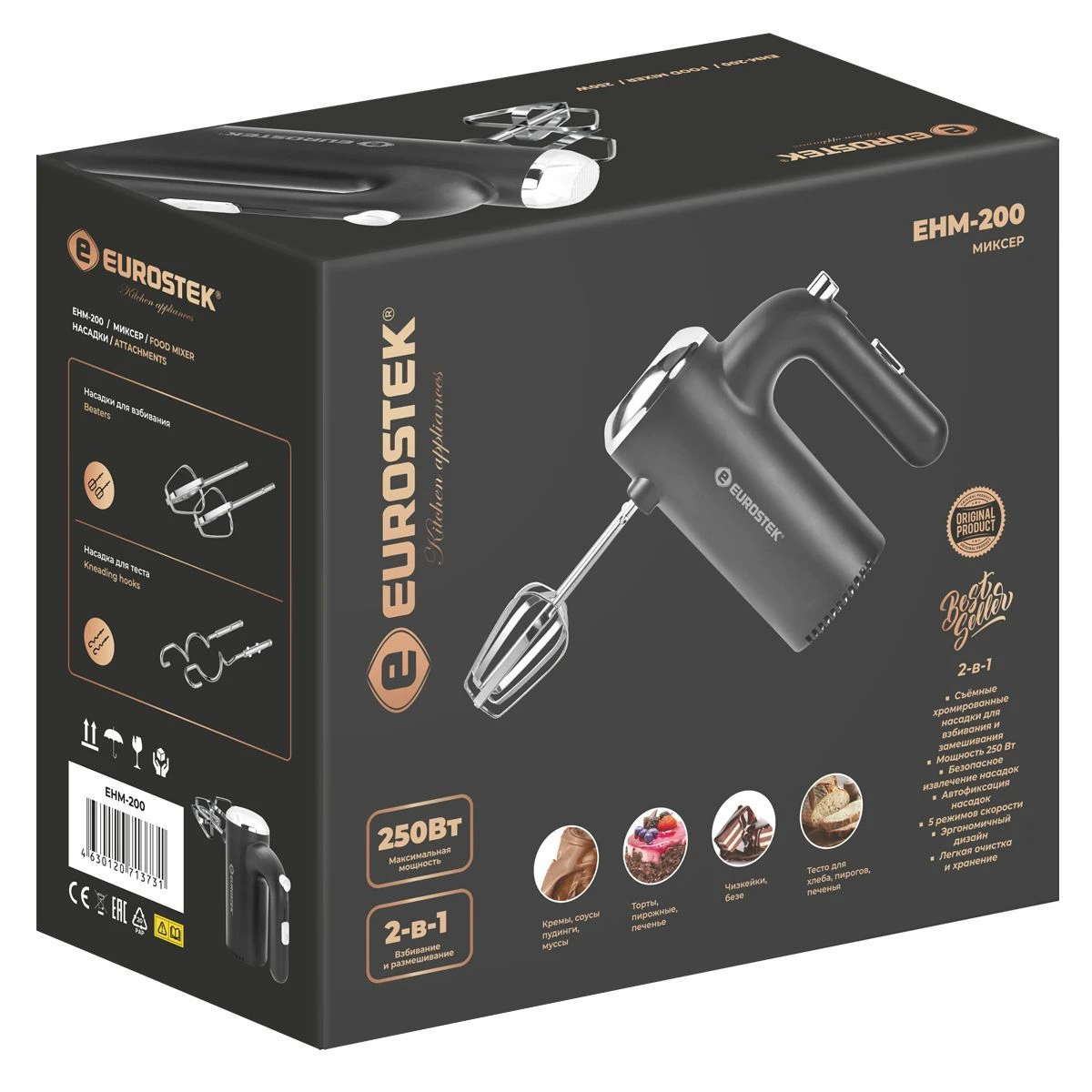 Миксер ручной Eurostek EHM-200. Мощность 250 Вт, 5 скоростей, 2 насадки для замешивания теста, насадки для взбивания, эргономичный дизайн.