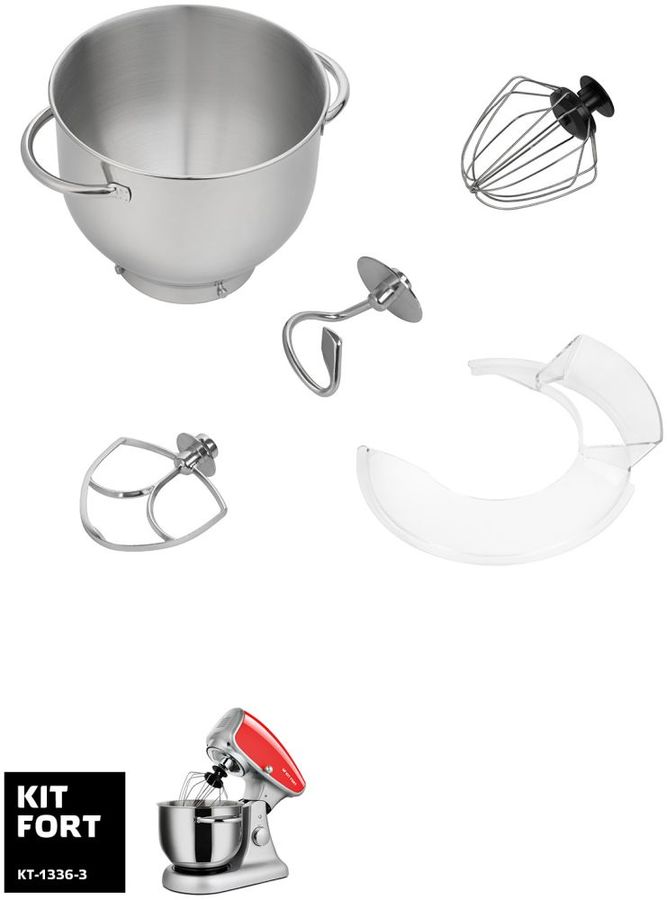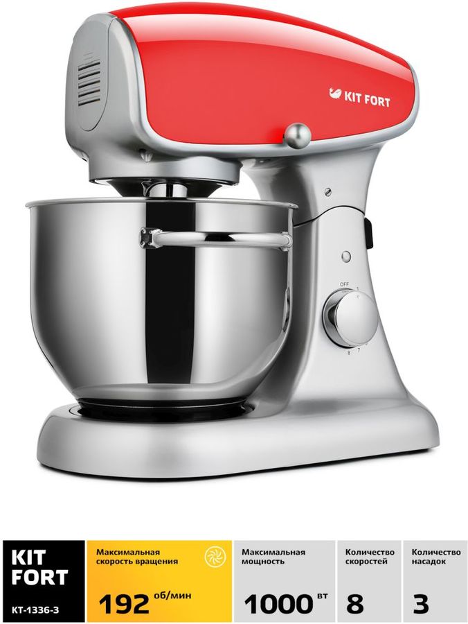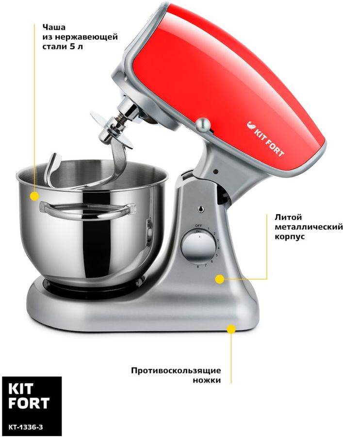 Особенности: высокая мощность; плавный старт; плавная регулировка скорости вращения; крышка с загрузочным отверстием на чашу; насадки для взбивания, перемешивания и для замеса теста; чаша из нержавеющей стали; низкий уровень шума; автоматическое отключение; противоскользящие ножки