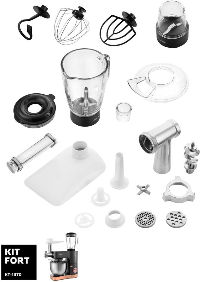 Описание: Многофункциональный и мощный планетарный миксер «5 в 1» поможет вам смешать ингредиенты, взбить яичный белок или сливки, приготовить картофельное пюре, соус, замесить тесто, раскатать тесто, перемолоть мясо на фарш, смешать ледяной коктейль или смузи.
