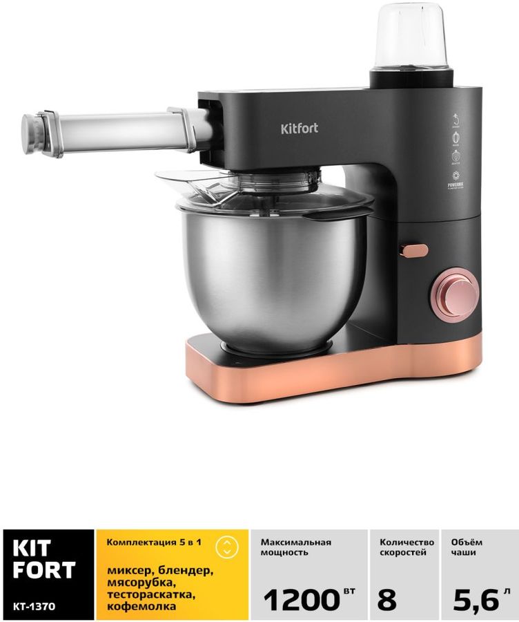 1200Вт; чаша нержавеющая сталь, 5.6л; импульсный режим; крюк для теста; венчик для взбивания