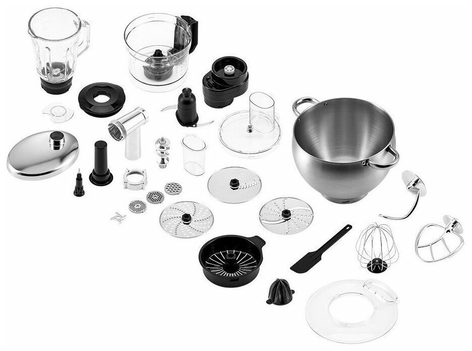 В комплекте с миксером идут венчик для взбивания, крюк для замеса крутого теста, насадка для смешивания и приготовления пюре. Форма насадок и чаши подобраны так, что почти при любом количестве продуктов насадка качественно их перемешает.