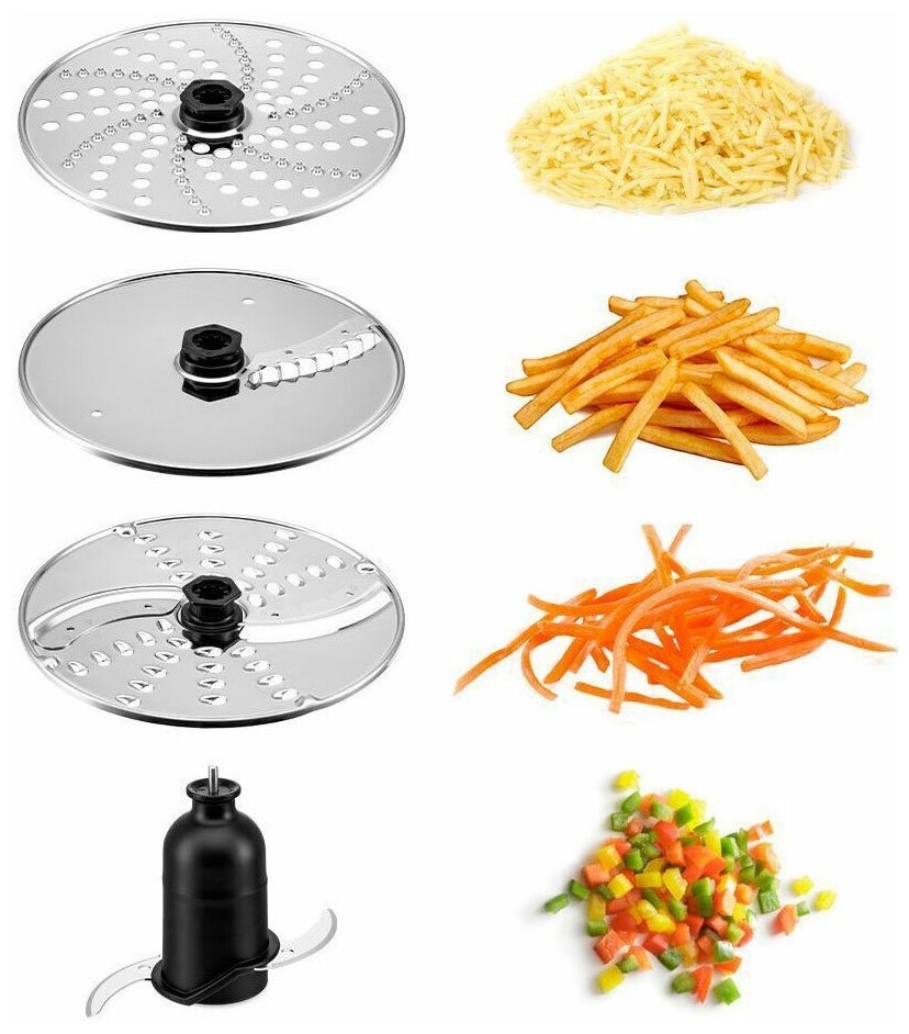 С установленными лезвиями комбайн работает как измельчитель. Он измельчает твёрдый сыр, травы, орехи. В комплекте также идут 3 диска: насадка с крупной тёркой/шинковка, насадка с мелкой тёркой и насадка для картофеля фри.