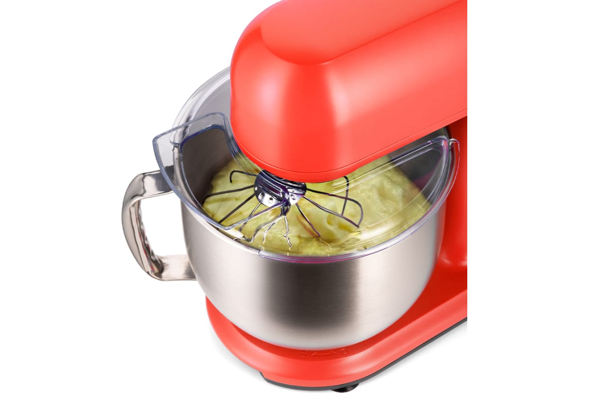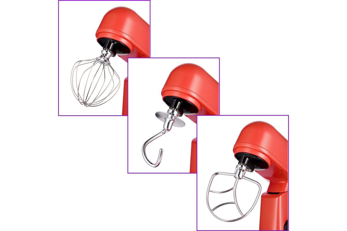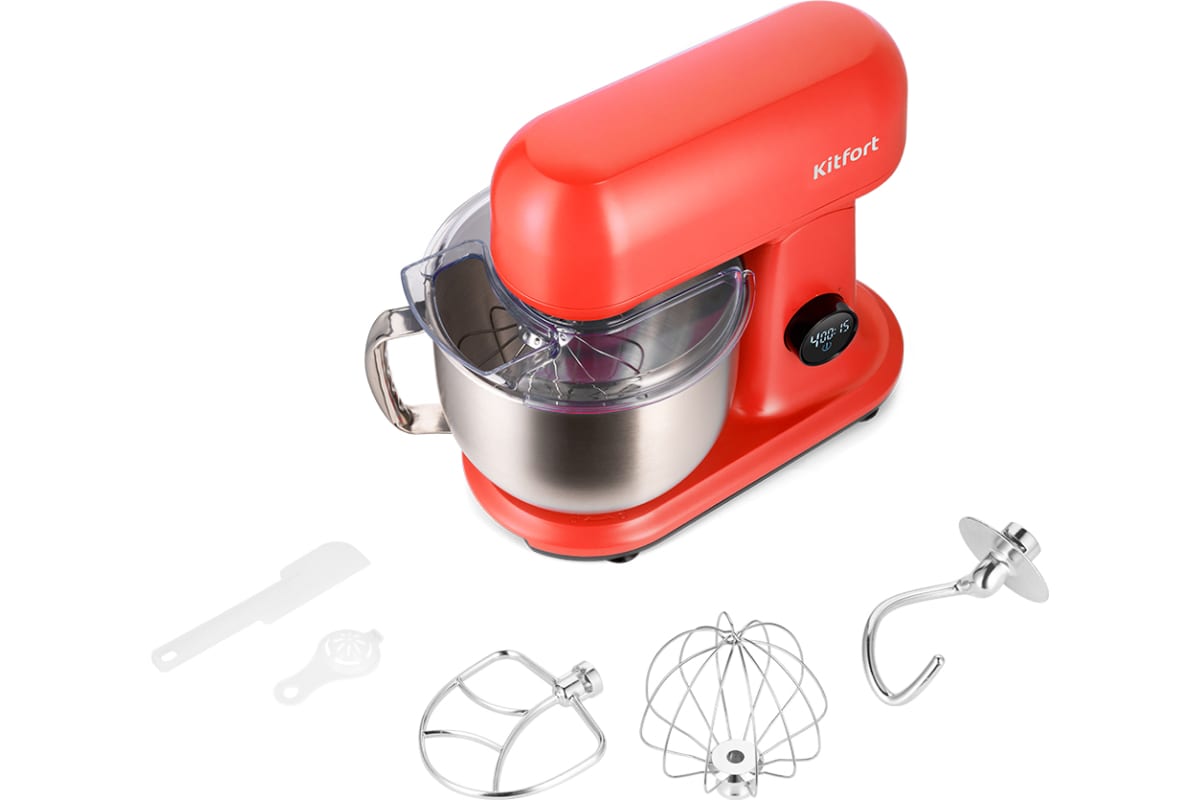 В комплекте идут венчик для взбивания, насадка для смешивания, крюк для замеса крутого теста, а также сепаратор для яиц и лопатка для ручного смешивания и вычищения остатков из чаши.