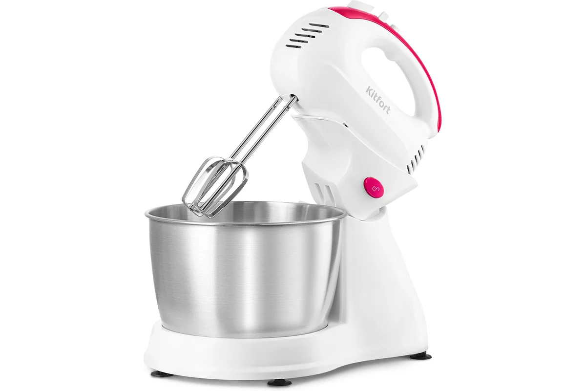 Миксер «2 в 1» КТ-3485 совмещает в себе ручной миксер и стационарный миксер с чашей. Он поможет вам взбить яичные белки, приготовить кремы, домашние соусы, а также жидкое тесто, например, для шарлотки, или густое — для сдобной выпечки. Миксер подходит для замешивания легких и плотных смесей, но не для замеса тугого теста, например, для пельменей.