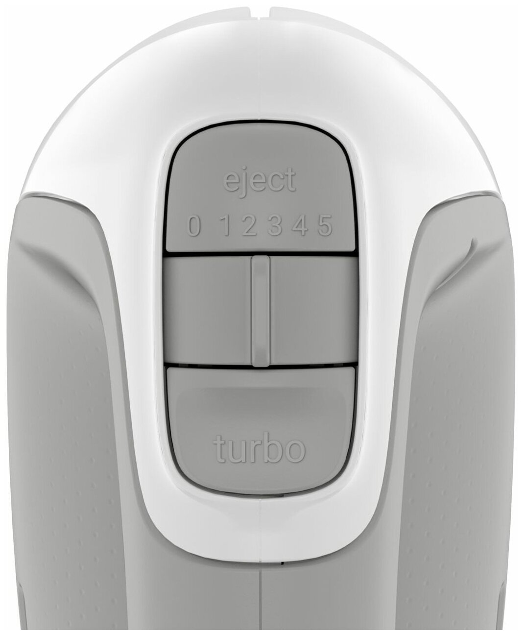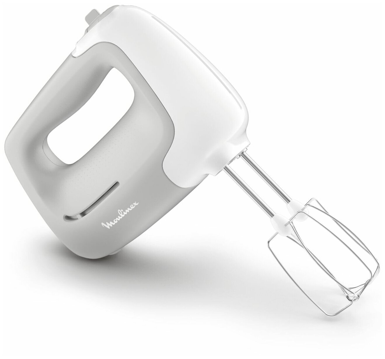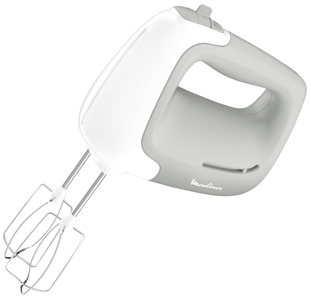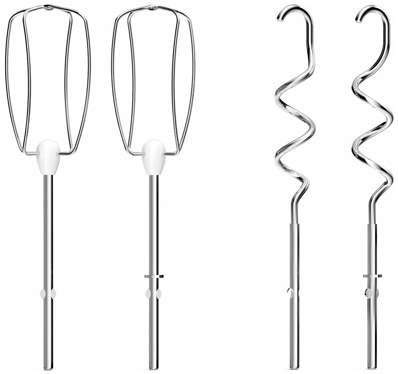 В комплекте идут две пары прочных металлических насадок. Ручка с текстурированным покрытием удобно лежит в руке и не выскальзывает в процессе работы. Когда вы закончили смешивание, поставьте устройство вертикально, чтобы не пачкать столешницу.