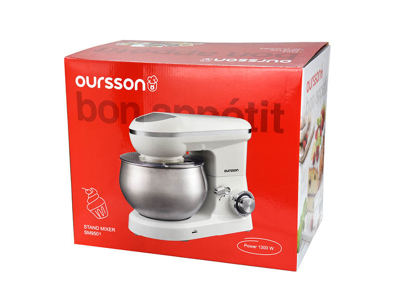 Надежный и стильный планетарный миксер с импульсным режимом SM9501 Oursson - незаменимый помощник на вашей кухне! Миксер предназначен для бытового использования и сочетает в себе 3 функции - замес теста, взбивание и смешивание. Планетарный принцип вращения насадок (вокруг своей оси и по окружности чаши миксера) обеспечивает наилучшее перемешивание ингредиентов до однородной консистенции. Удобное механическое управление предусматривает 6 скоростей смешивания. Дополнительная функция прибора – импульсный режим. Краткосрочный выход на пиковую мощность обеспечивает получение максимально однородной смеси. Вместительная чаша объёмом 5 л изготовлена из пищевой нержавеющей стали марки 304. Прозрачная крышка защищает от брызг во время перемешивания. Через отверстие в крышке можно подавать продукты в чашу миксера даже во время перемешивания, без остановки прибора. Комплект насадок (венчик для взбивания, крюк для теста, насадка для смешивания) обеспечивает реализацию самых разнообразных кулинарных рецептов.