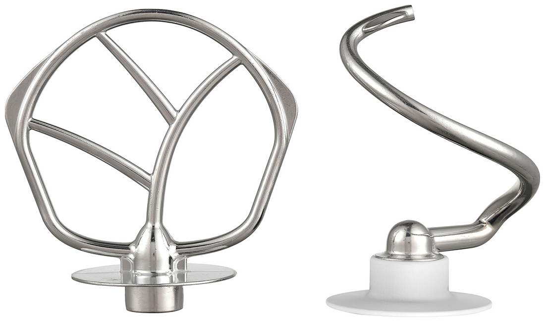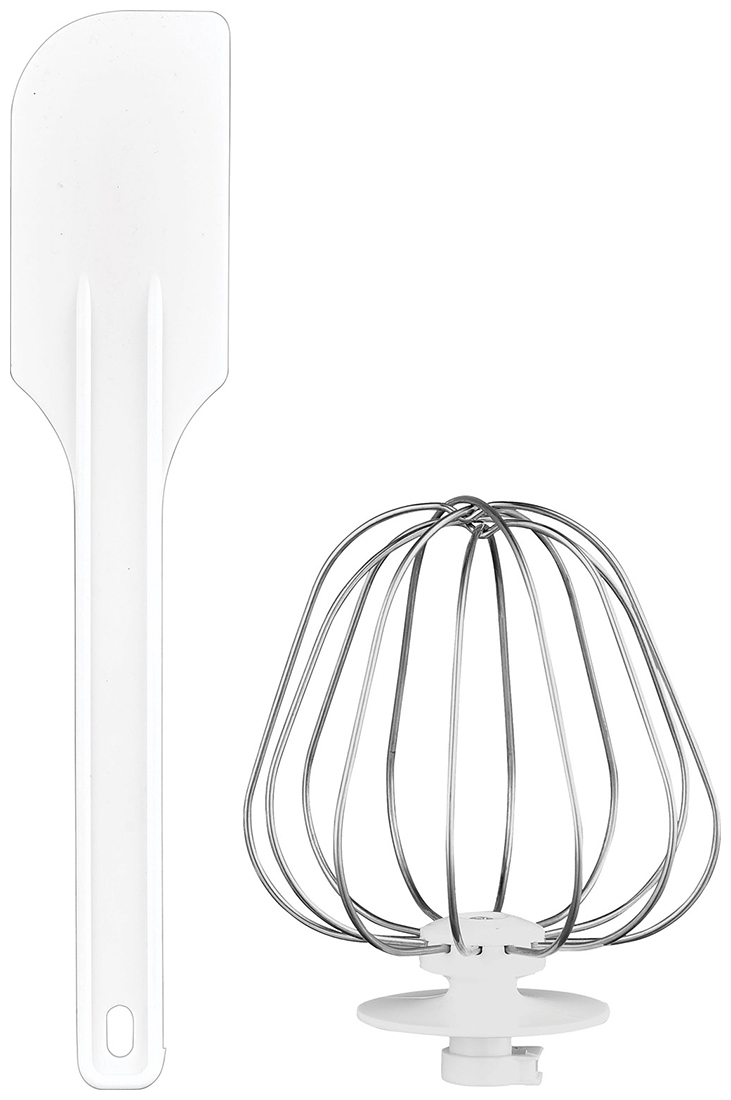 Миксер, чаша из нержавеющей стали, крышка чаши, крючок для замеса теста, лопатка для перемешивания, венчик для взбивания, лопатка, инструкция на русском языке