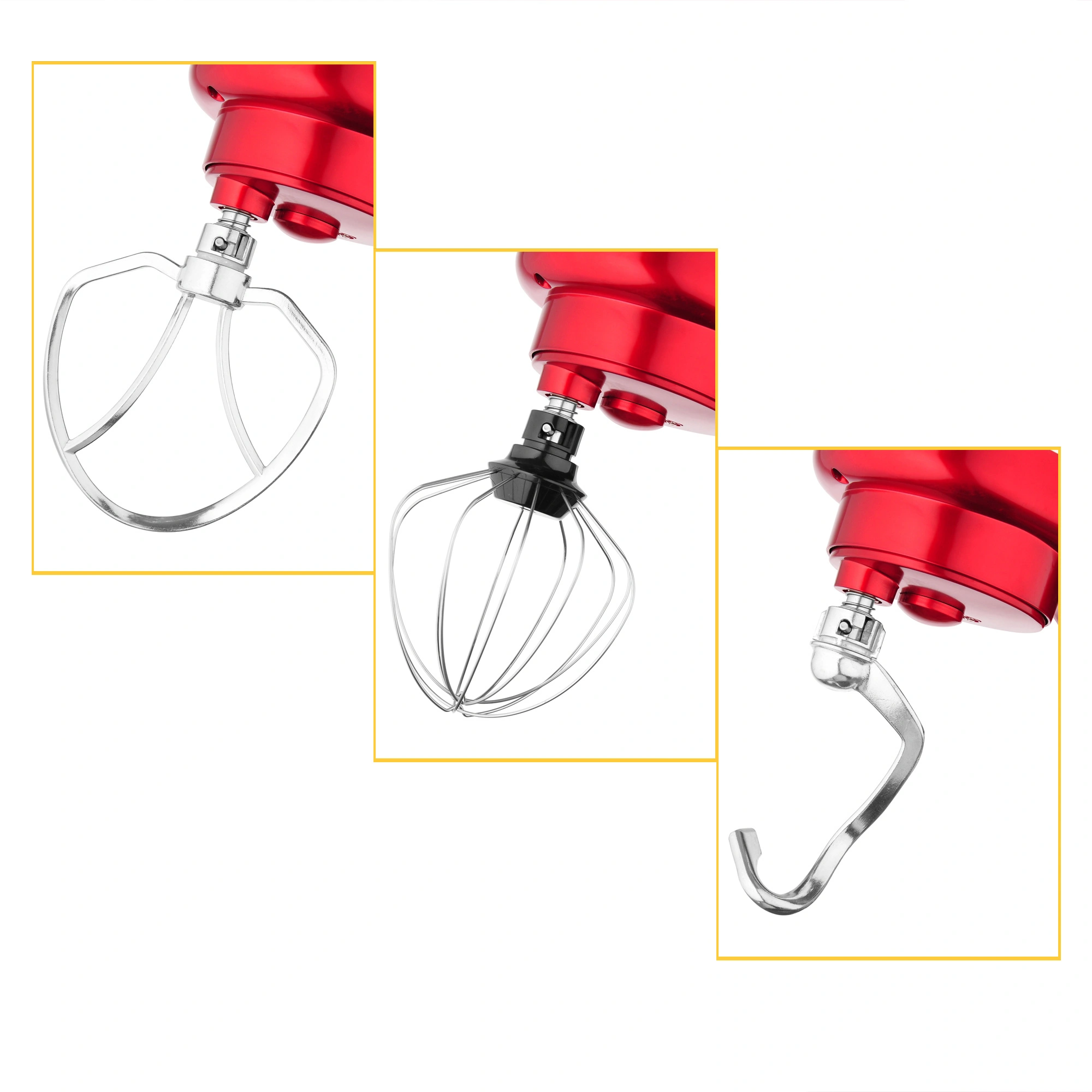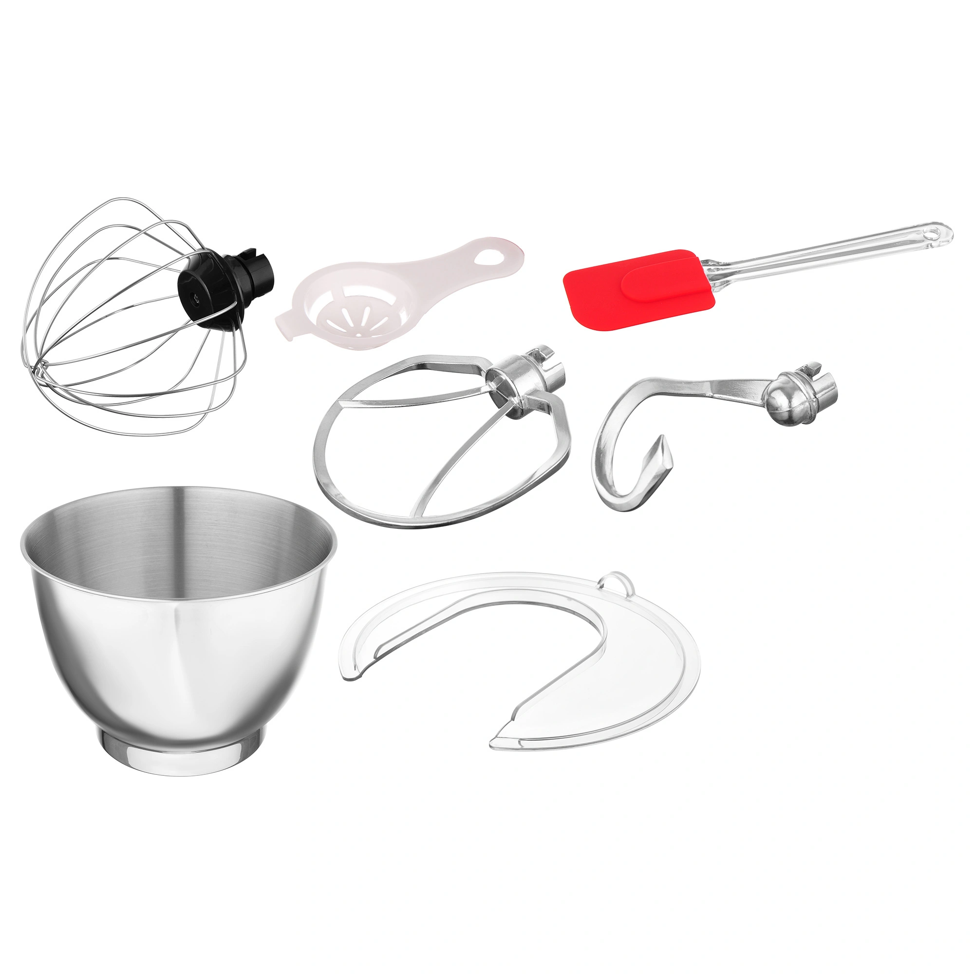 Планетарный миксер; чаша; защитная крышка; насадка-венчик; насадка-крюк; насадка-лопатка; кулинарная силиконовая лопатка; сепаратор для яиц; руководство пользователя с гаратийным талоном; книга рецептов