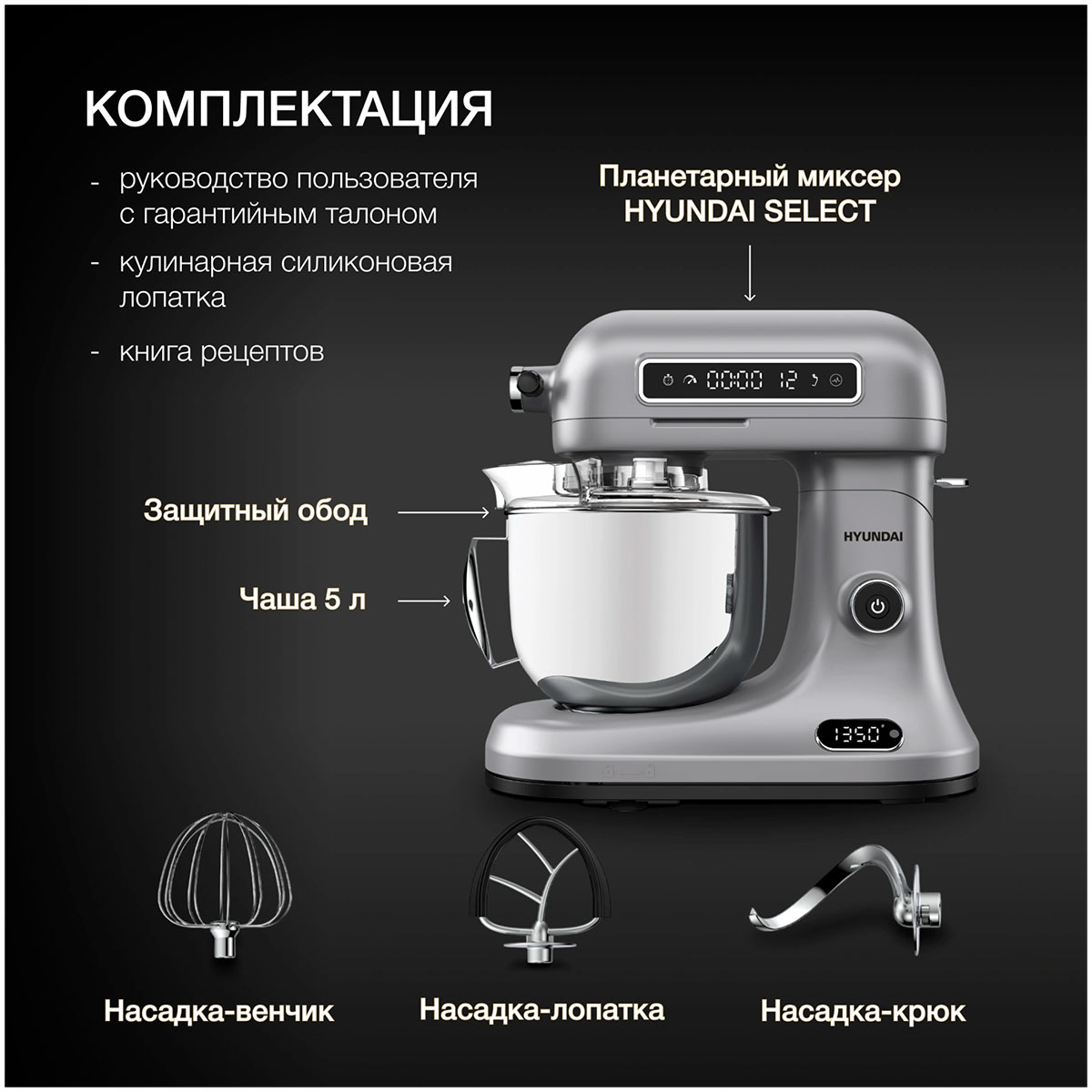 Миксер; чаша; защитная крышка; насадка-венчик; насадка-лопатка с гибким ребром; насадка-крюк; кулинарная силиконовая лопатка; книга рецептов; инструкция с гарантийным талоном