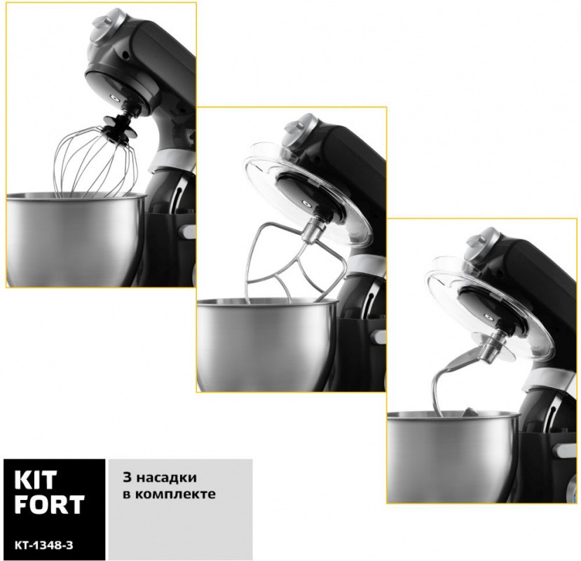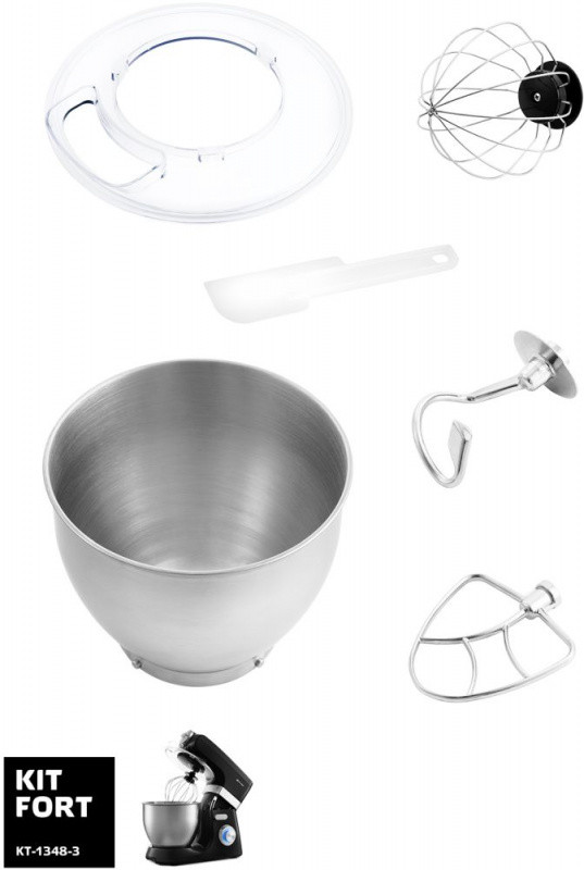 Комплектация: Миксер, чаша, крышка чаши, венчик для взбивания, насадка для смешивания, крюк для замеса теста, пластиковый шпатель, сепаратор для яичных белков, инструкция