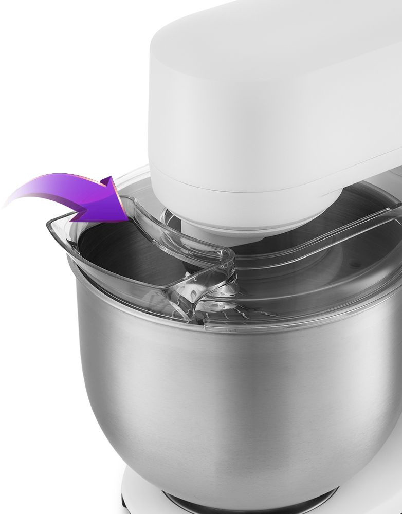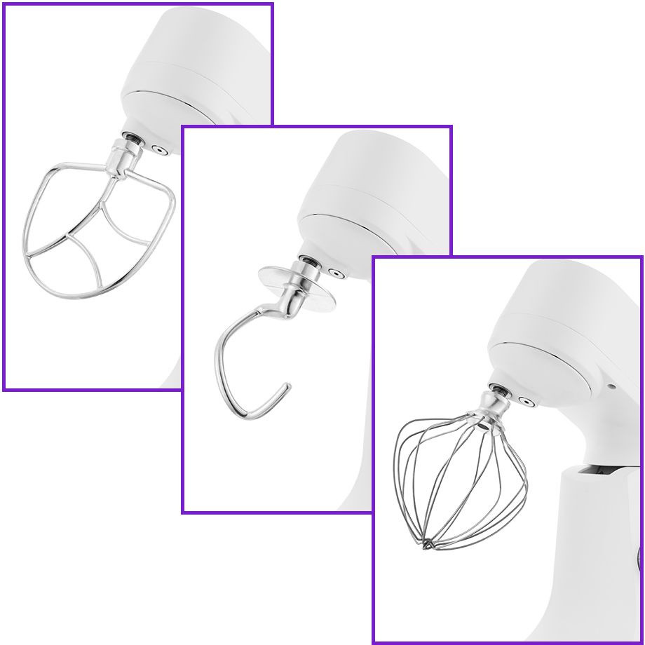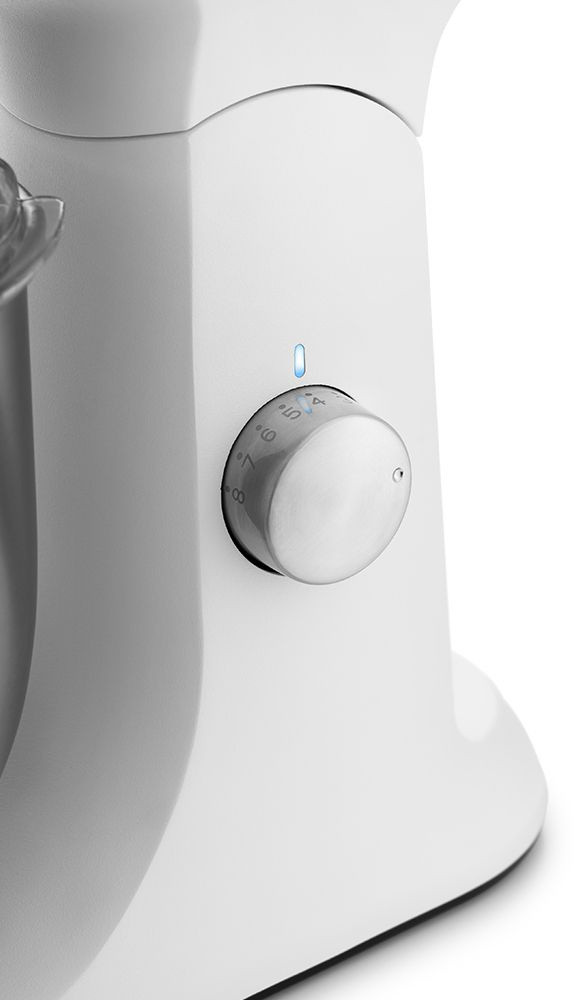 Комплектация: венчик для взбивания, крюк для замеса крутого теста, насадка для смешивания и приготовления пюре, сепаратор для яиц, лопатка для ручного смешивания и вычищения остатков из чаши, защитная крышка с загрузочным отверстием