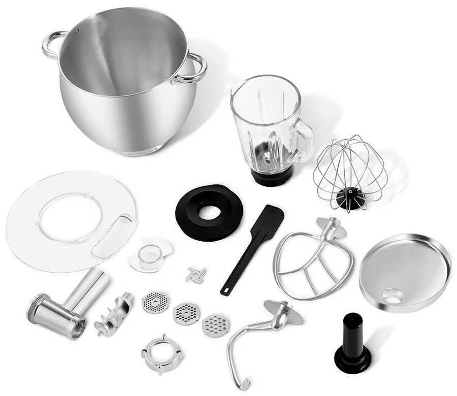 Вместе с устройством в комплекте идёт широкий ассортимент различных насадок. Чаша миксера объёмом 12 литров позволит замешать ингредиенты на целую семью или большую компанию.