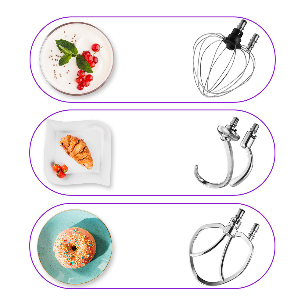 венчик для взбивания, для приготовления фарша, крючки для замешивания теста, насадка для приготовления пюре, насадка-блендер