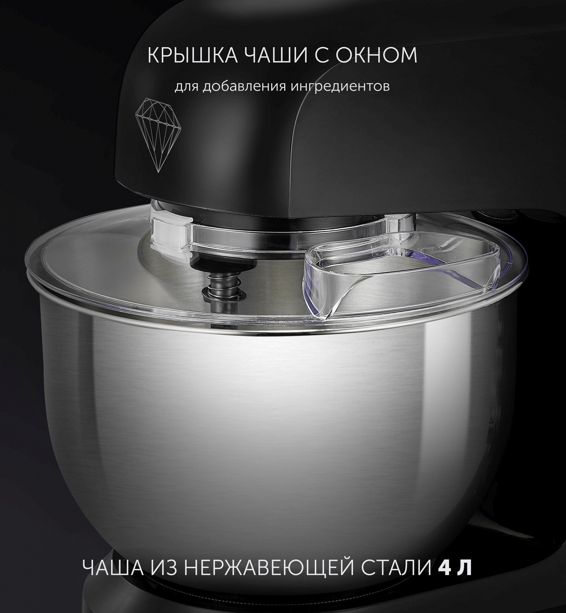 Описание: PROGEAR INSIDE надёжная конструкция со стальной шестернёй. Технология PROtect+ защита двигателя от перегрева. Чаша из нержавеющей стали. 3 в 1: Для Взбивания, Замешивания, Смешивания.