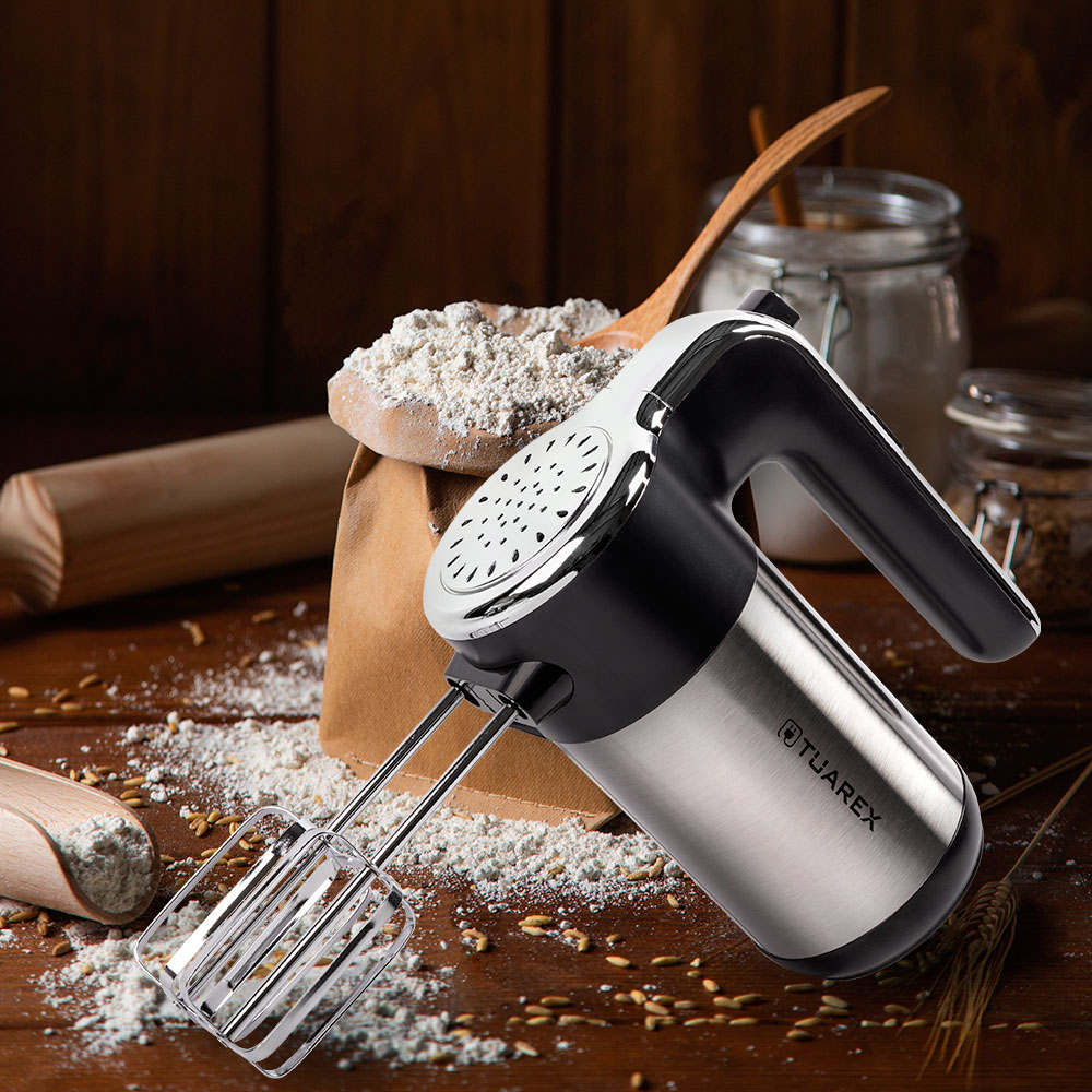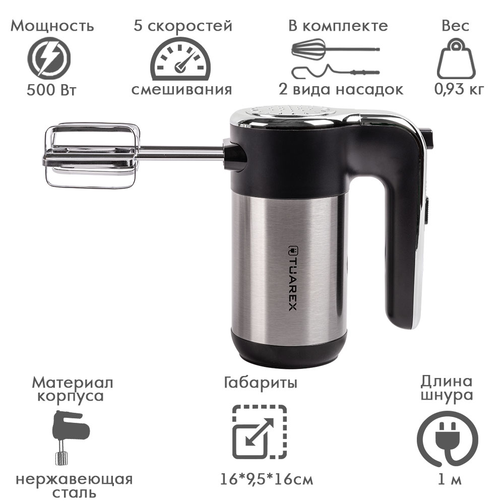 5 скоростей смешивания, Материал: нержавеющая сталь, Прочный корпус с удобной эргономичной ручкой, 2 комплекта насадок, Кнопка высвобождения насадок