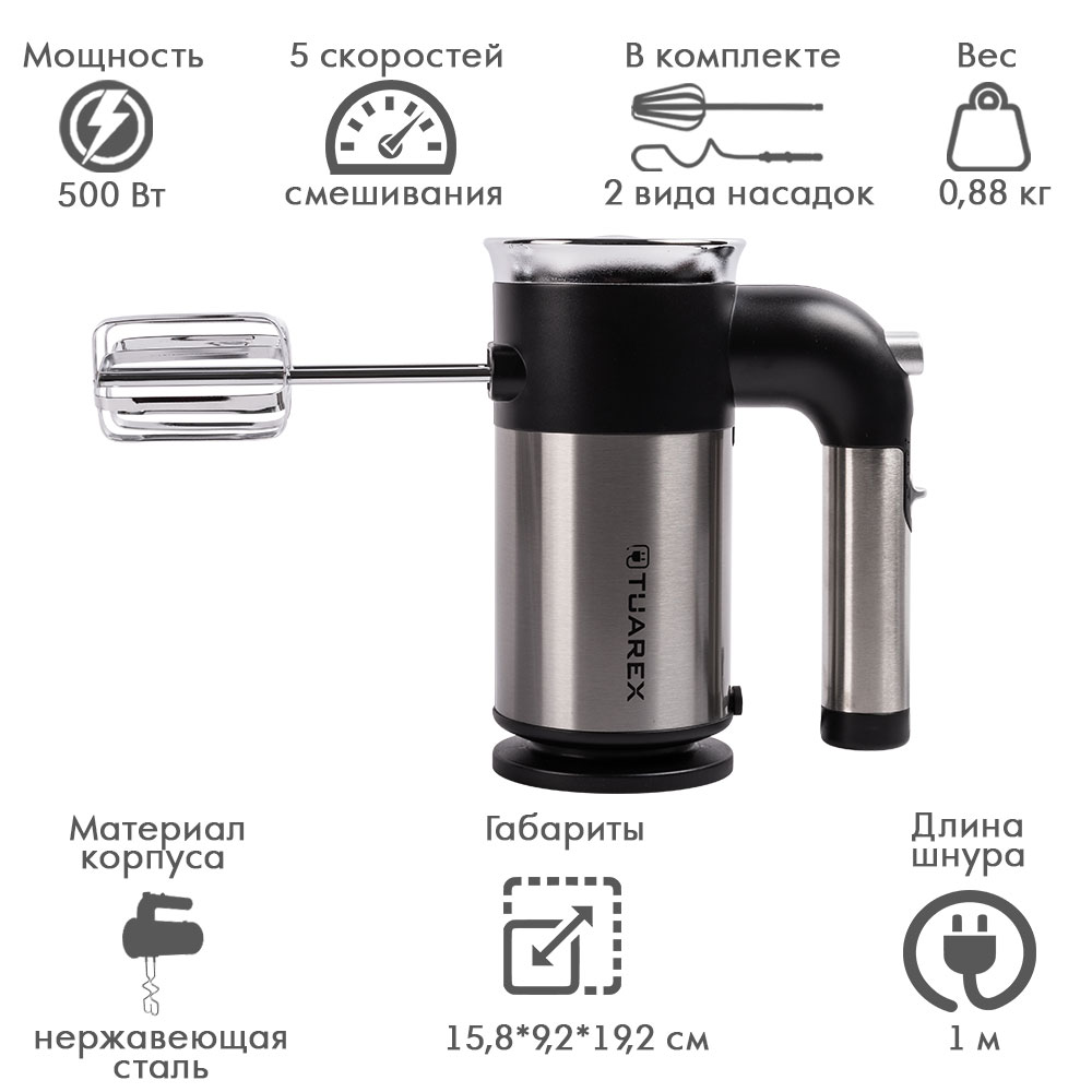5 скоростей смешивания, Материал: нержавеющая сталь, Прочный корпус с удобной эргономичной ручкой, 2 комплекта насадок, Кнопка высвобождения насадок