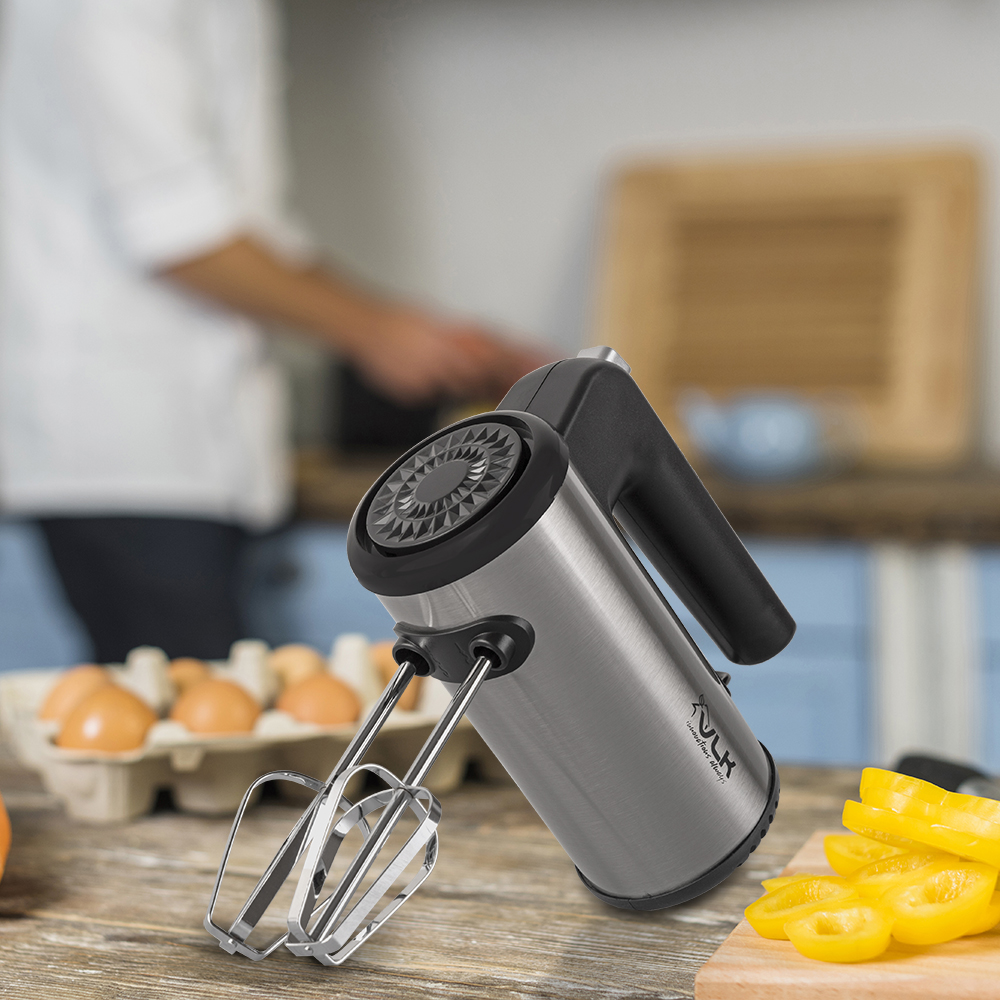 5 скоростей смешивания, Материал: нержавеющая сталь, Прочный корпус с удобной эргономичной ручкой, 2 комплекта насадок, Кнопка высвобождения насадок