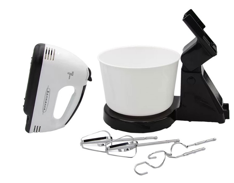 В наборе два комплекта насадок – венички для взбивания яиц и крема, крючки для замешивания тяжелого теста.