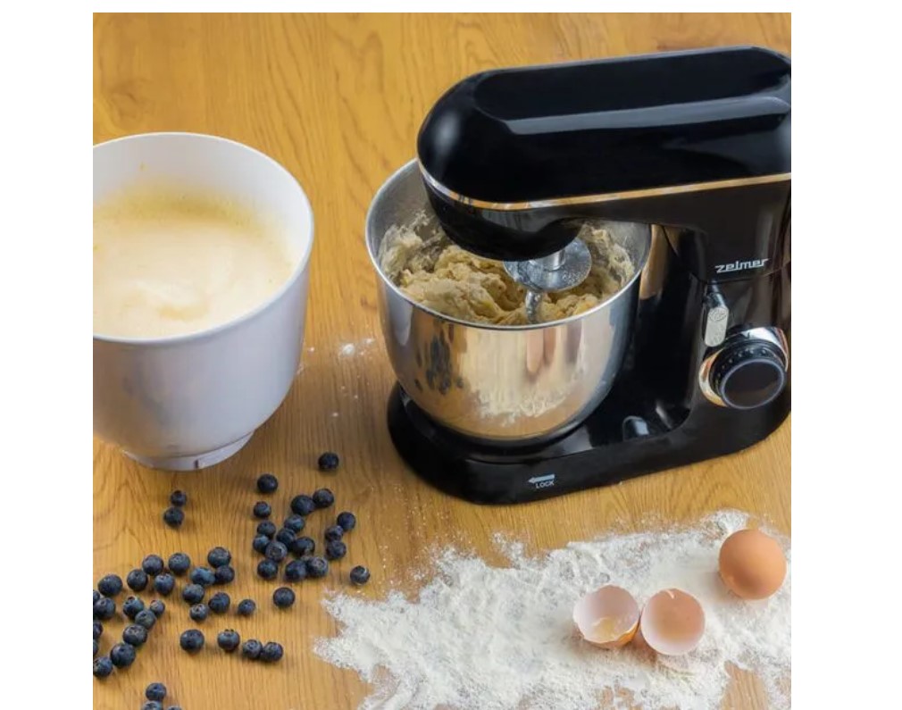 В комплект с планетарным роботом входят две чаши – стальная емкостью 4,5 л и пластиковая емкостью 5,5 л.Благодаря этому можно свободно приготовить, например, чизкейк – смешать сырную массу в одну миску, а в другой взбить яичные белки. Это также облегчит работу с другими видами тортов. Мы также добавили крышку, которой можно накрыть робота, защищая кухню от брызг во время работы устройства.