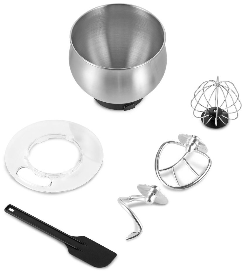 В комплекте с миксером идут венчик для взбивания, крюк для замеса крутого теста, насадка для смешивания и приготовления пюре. Защитный кожух надевается сверху на насадки и предотвращает попадание продуктов на шпиндель во время работы прибора.