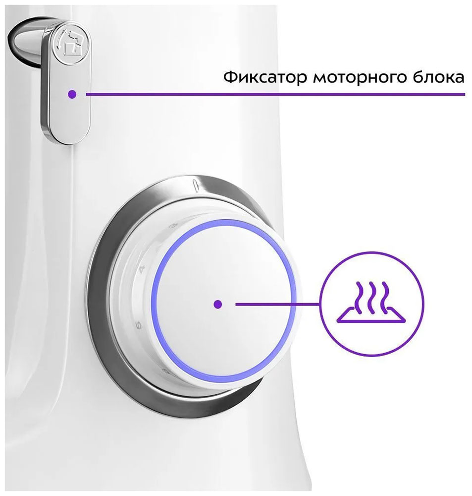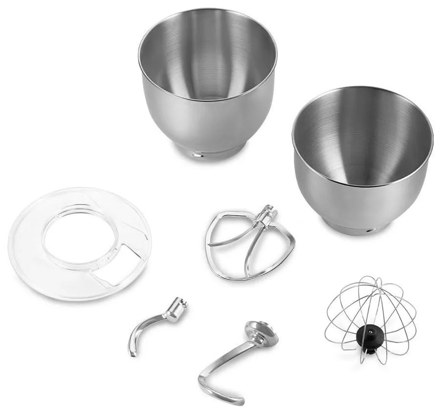 В комплекте с миксером идут венчик для взбивания, крюк для замеса крутого теста, насадка для смешивания и приготовления пюре. Форма насадок и чаши подобраны так, что почти при любом количестве продуктов насадка качественно их перемешает.