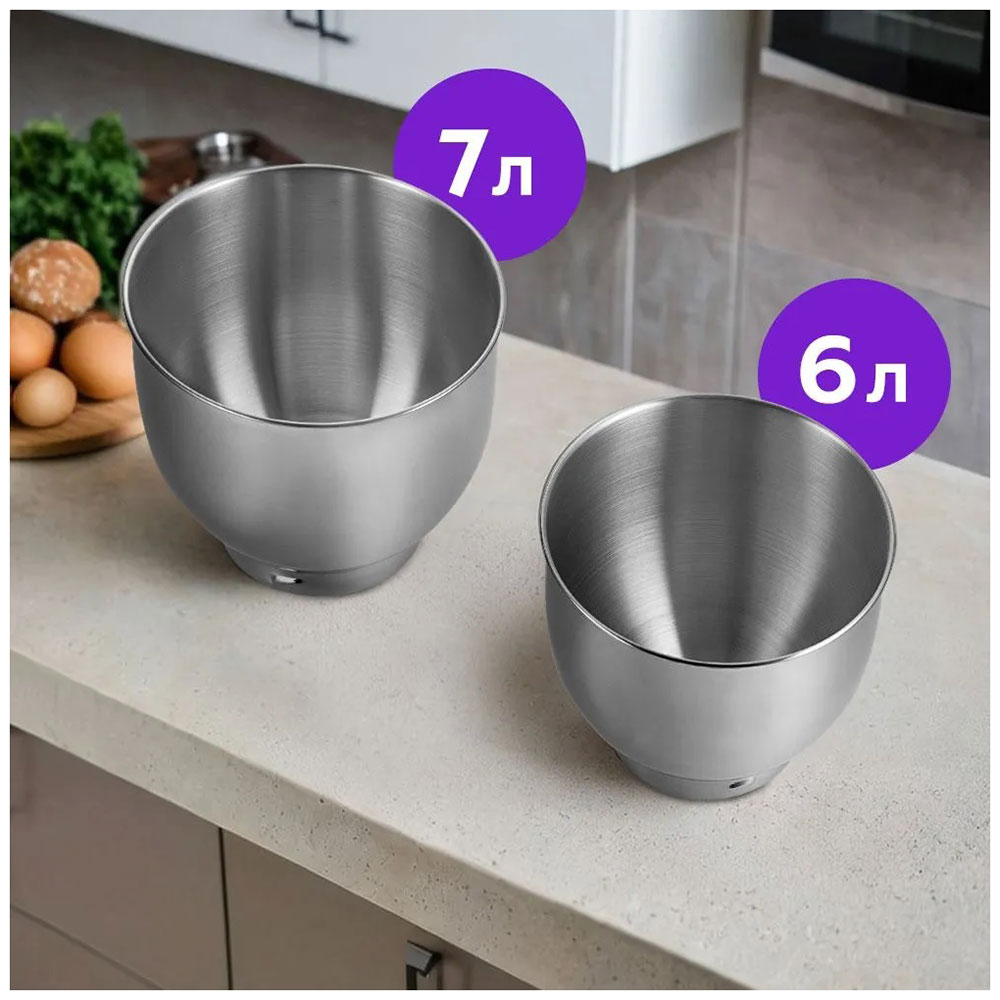 Миксер оснащён 2-мя вместительными чашами ёмкостью 6л. и 7л. Чаши прочная, выполнена из нержавеющей стали, в ней можно смешивать даже горячие ингредиенты. Крышка предотвращает разбрызгивание и позволяет добавлять ингредиенты прямо во время работы!