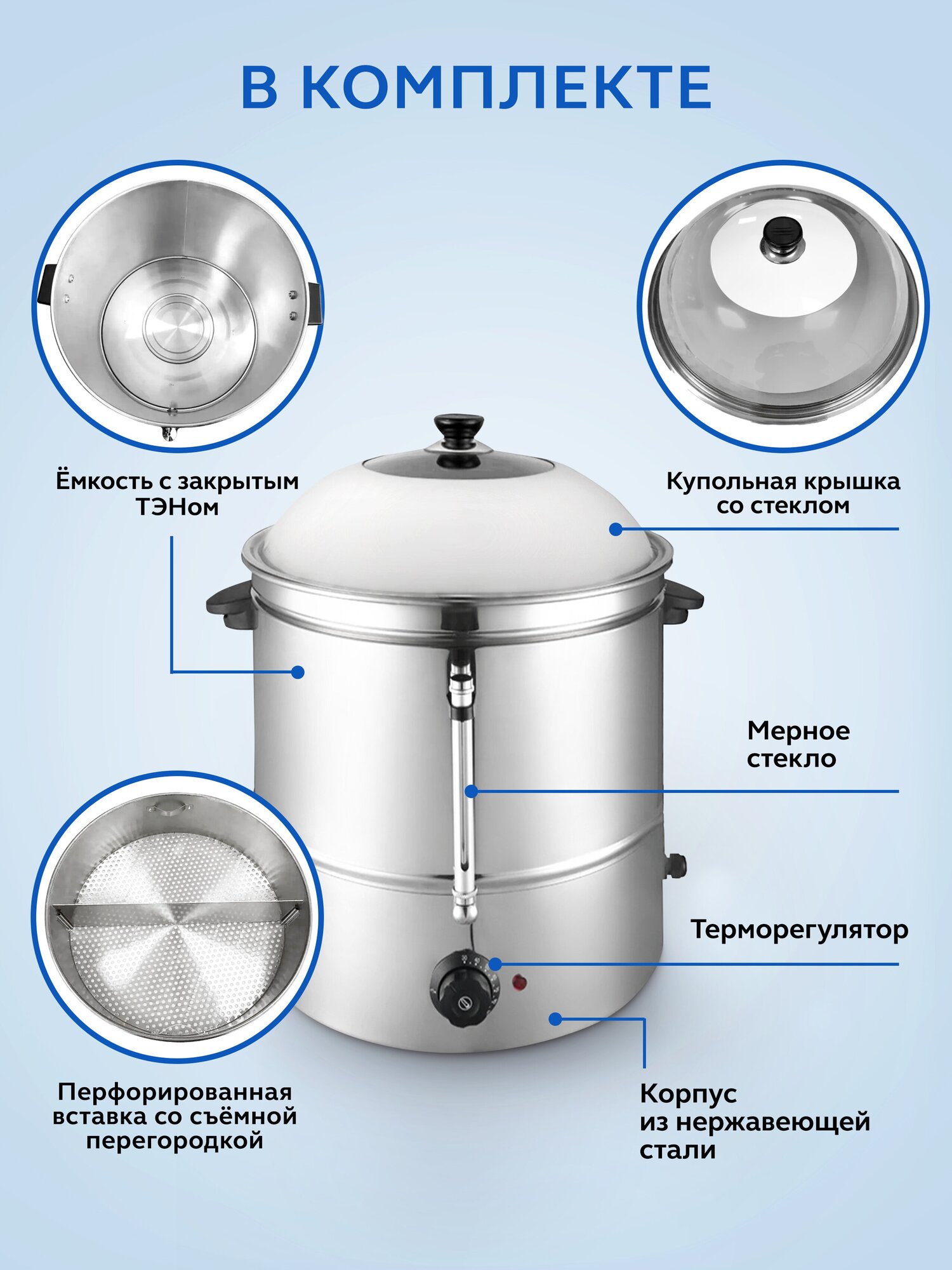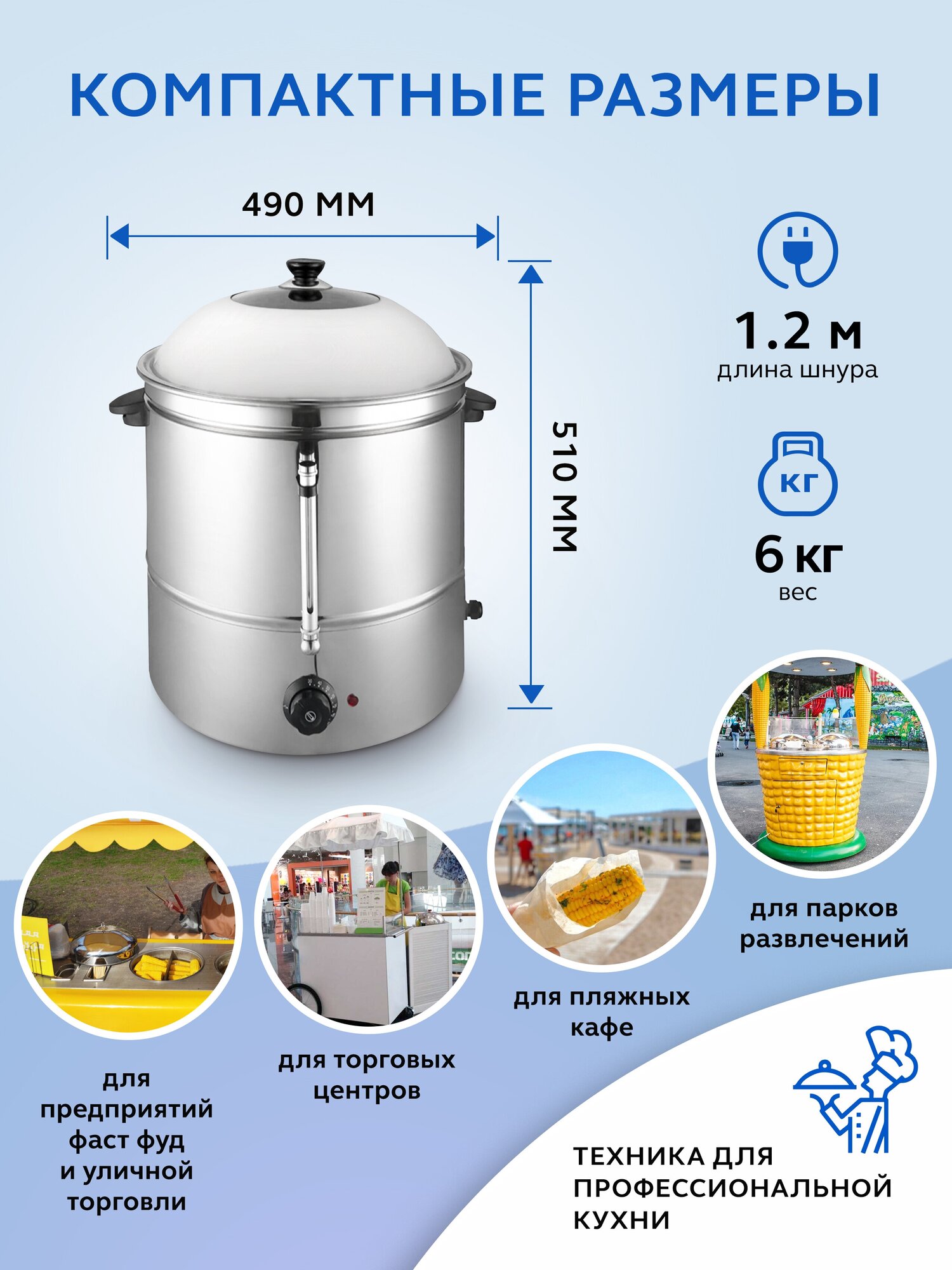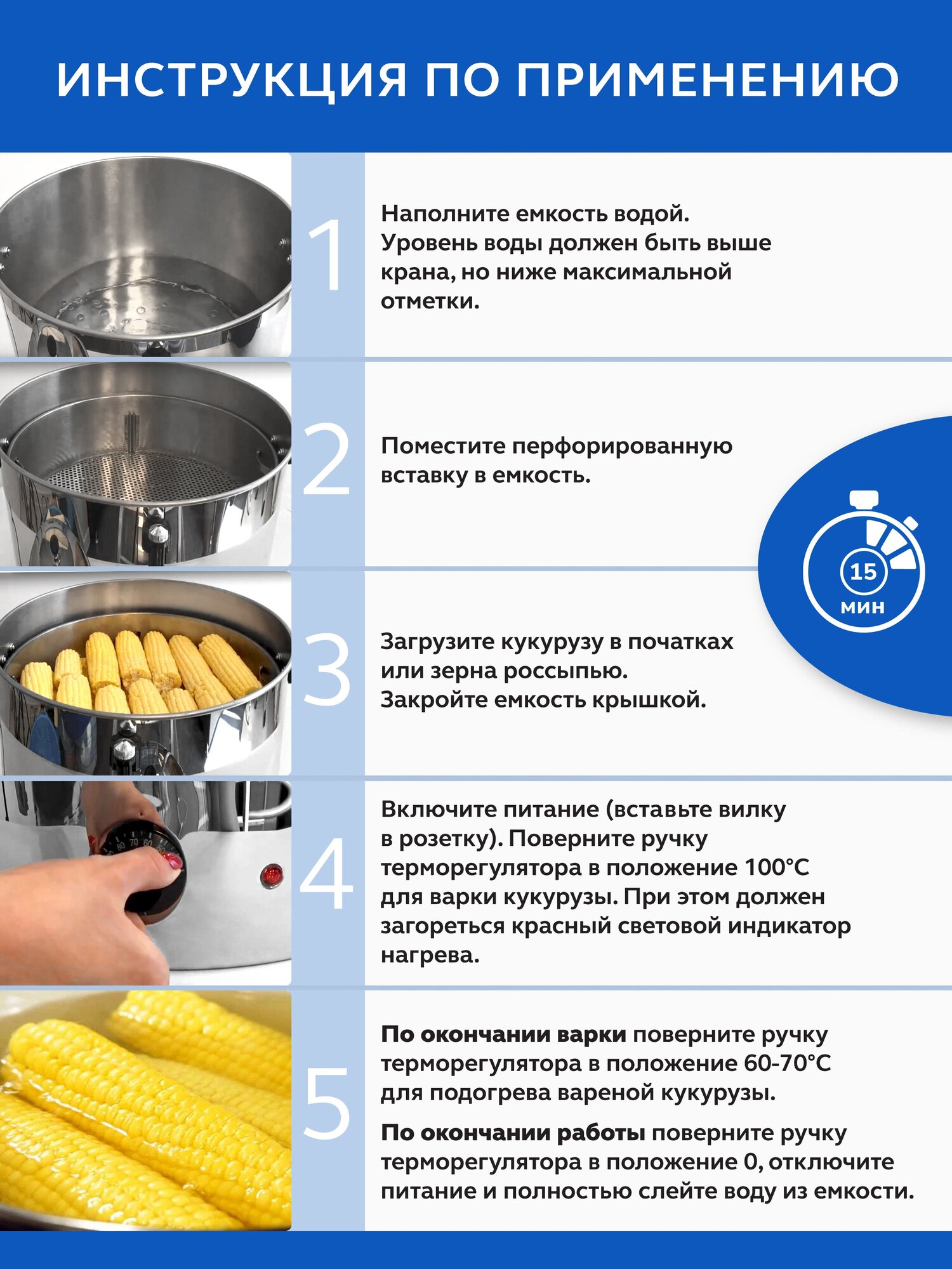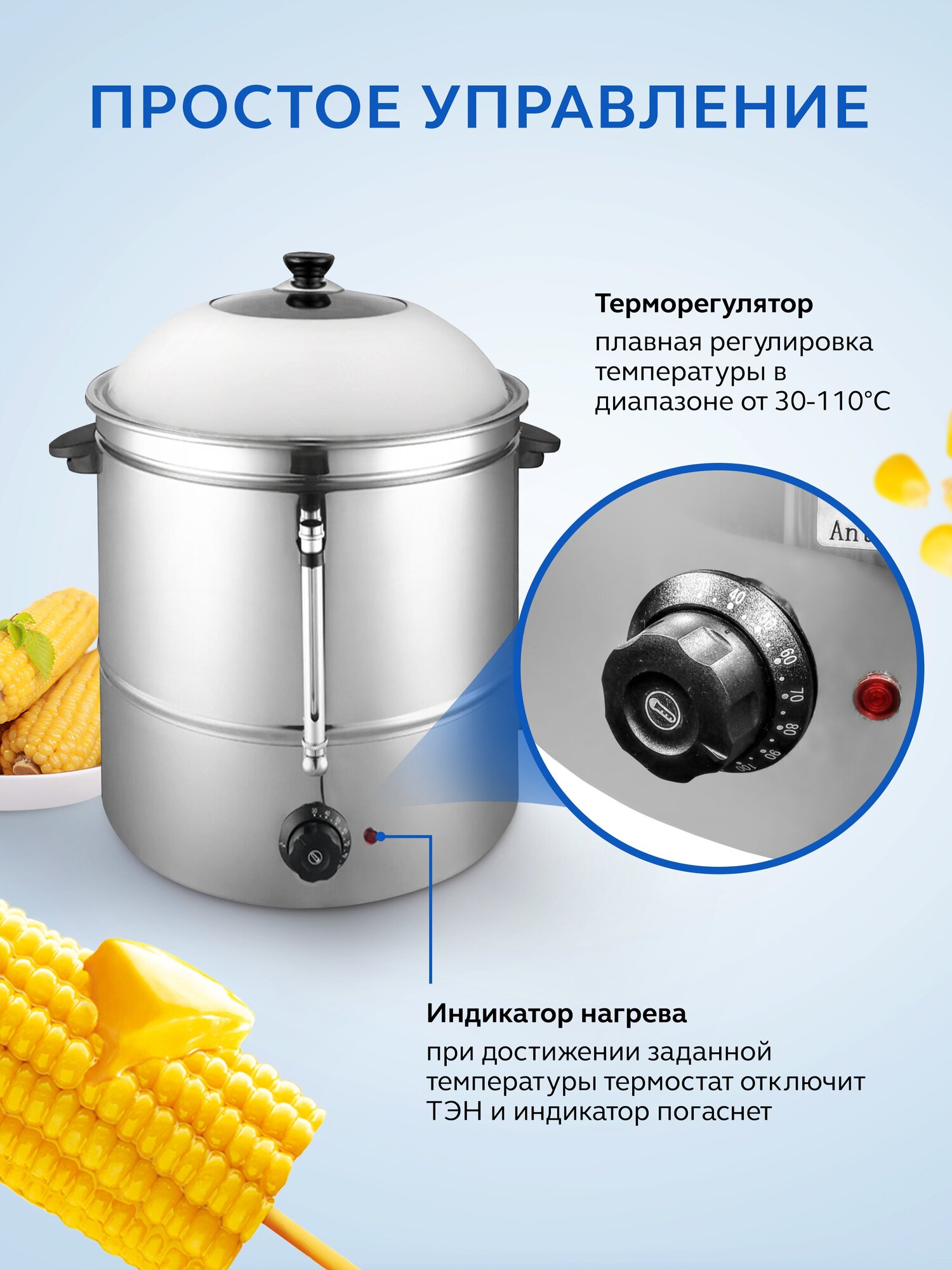 Есть мерное стекло, позволяющее отслеживать уровень воды. Внутри имеется перфорированная вставка для удобной загрузки кукурузы. Корпус выполнен из нержавеющей стали.