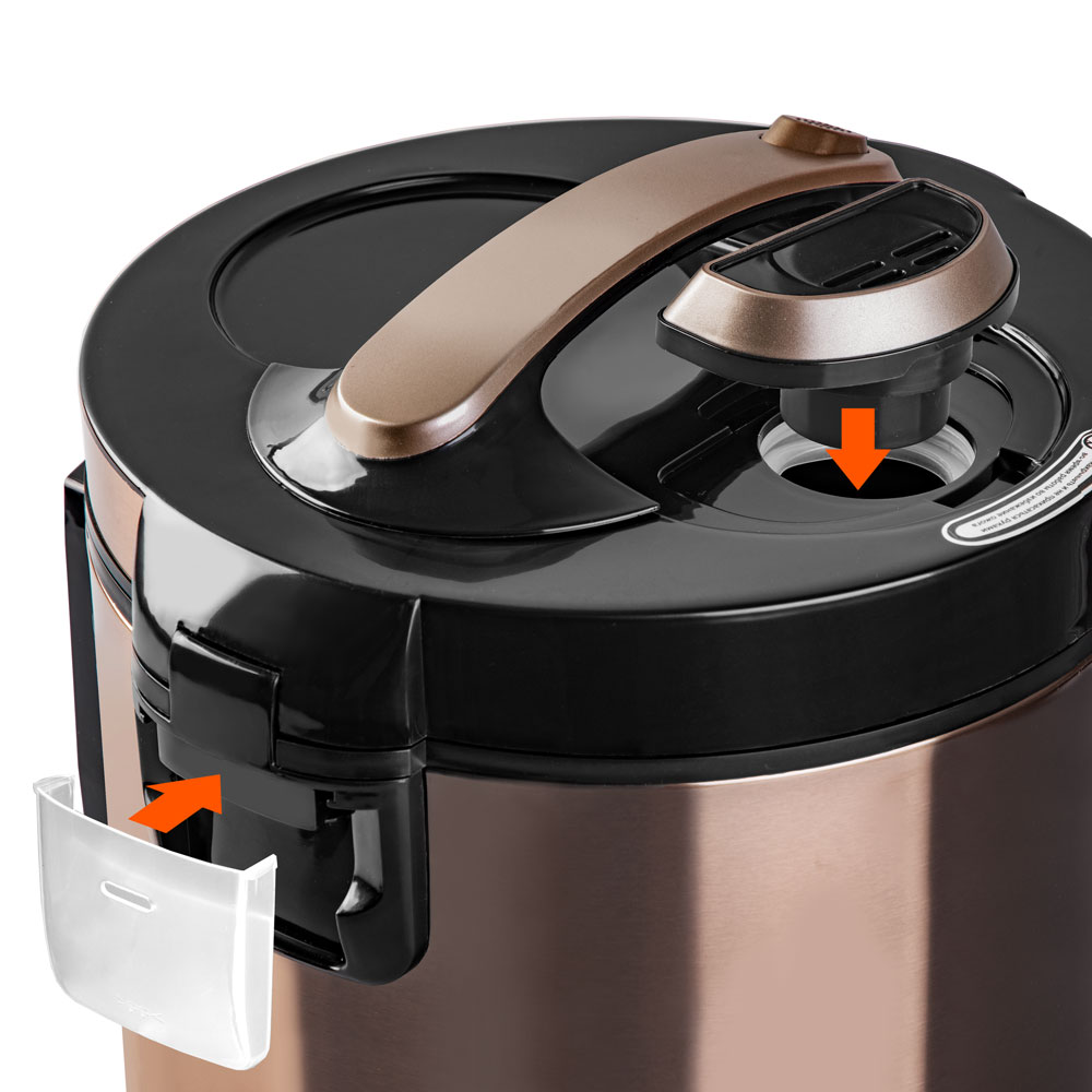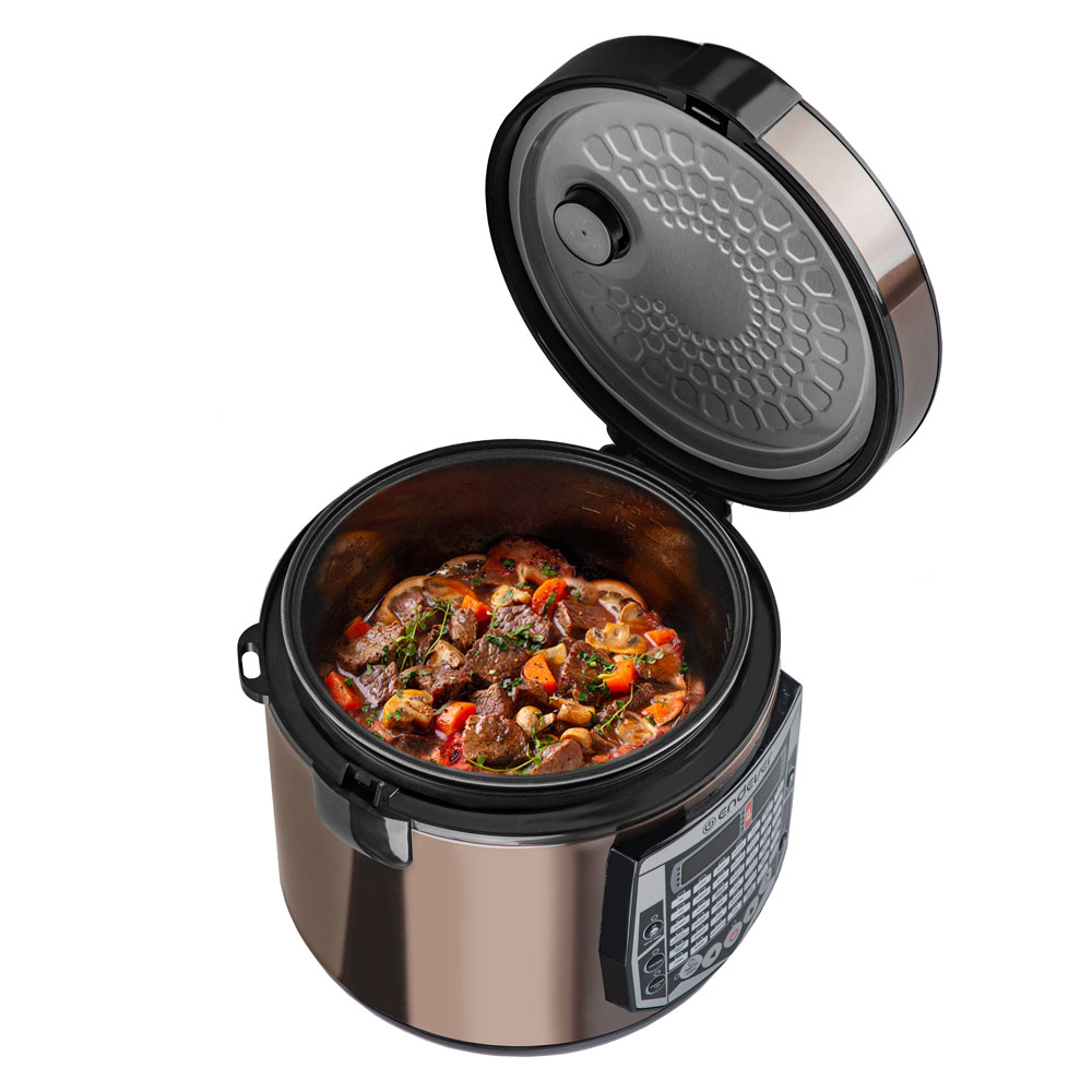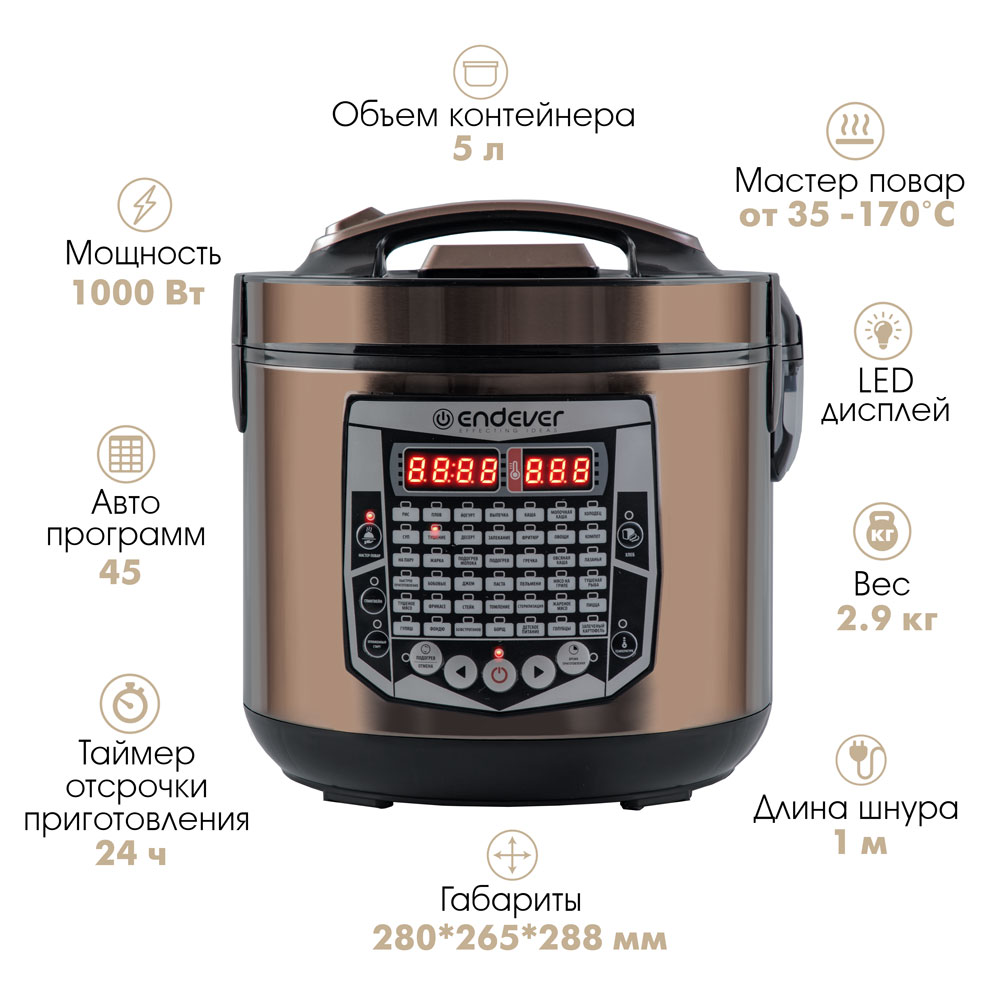 45 автоматических программ, Электронное управление, Функция «Мастер-повар» (35°–170°С), Автоподогрев до 12 часов, Таймер отсрочки приготовления до 24 часов, LED-дисплей, Ручная регулировка времени приготовления, Съемная чаша с высококачественным антипригарным покрытием, Металлический корпус