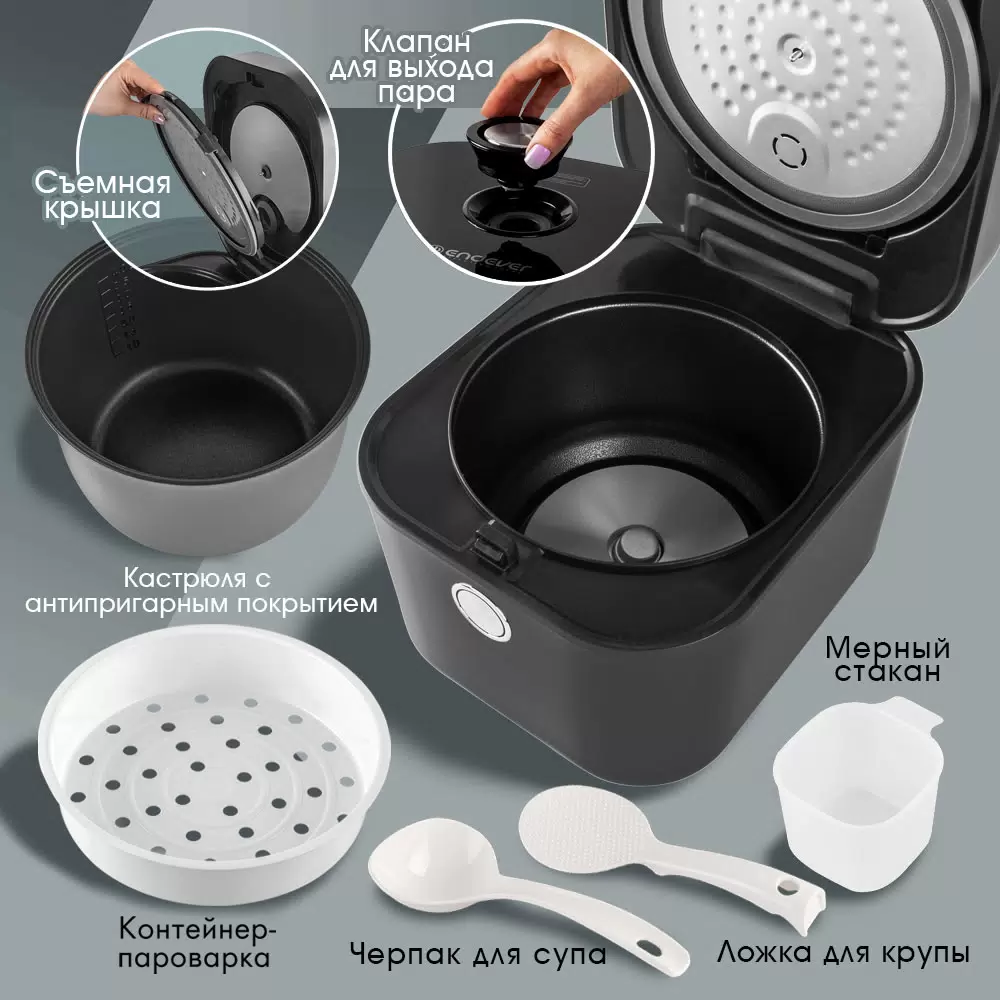 Мультиварка, Съемный каплесборник для конденсата, Клапан выпуска пара, Съемная чаша, Контейнер-пароварка, Черпак для супа, Ложка для крупы, Мерный стакан, Шнур питания, Руководство по эксплуатации, Книга рецептов, Гарантийный талон