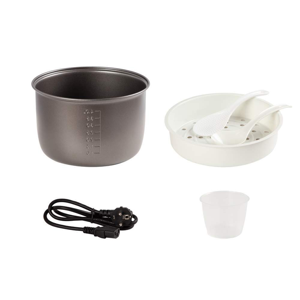 чаша; корзина для приготовления на пару; мерный стакан; плоская ложка; половник; книга рецептов