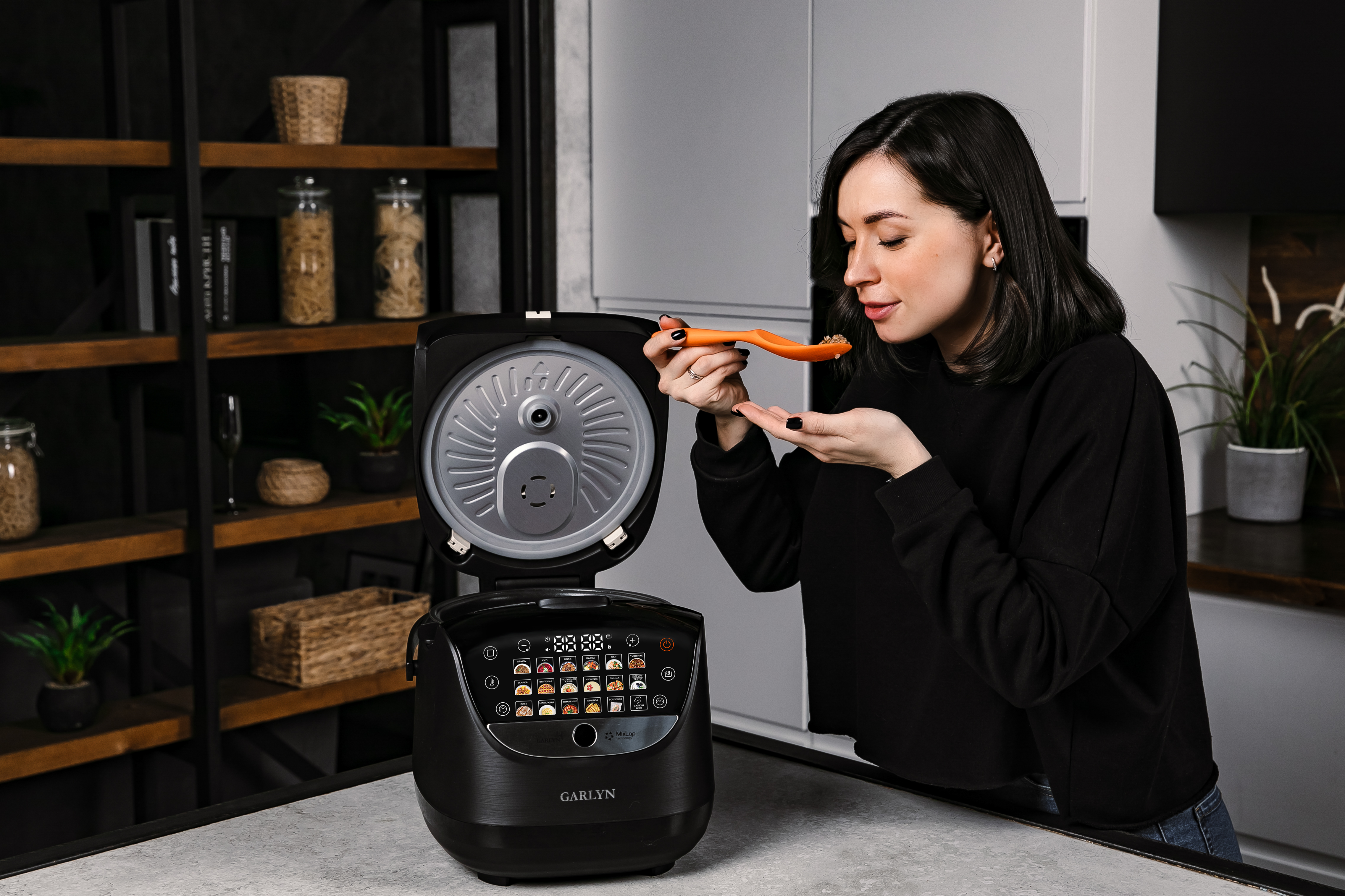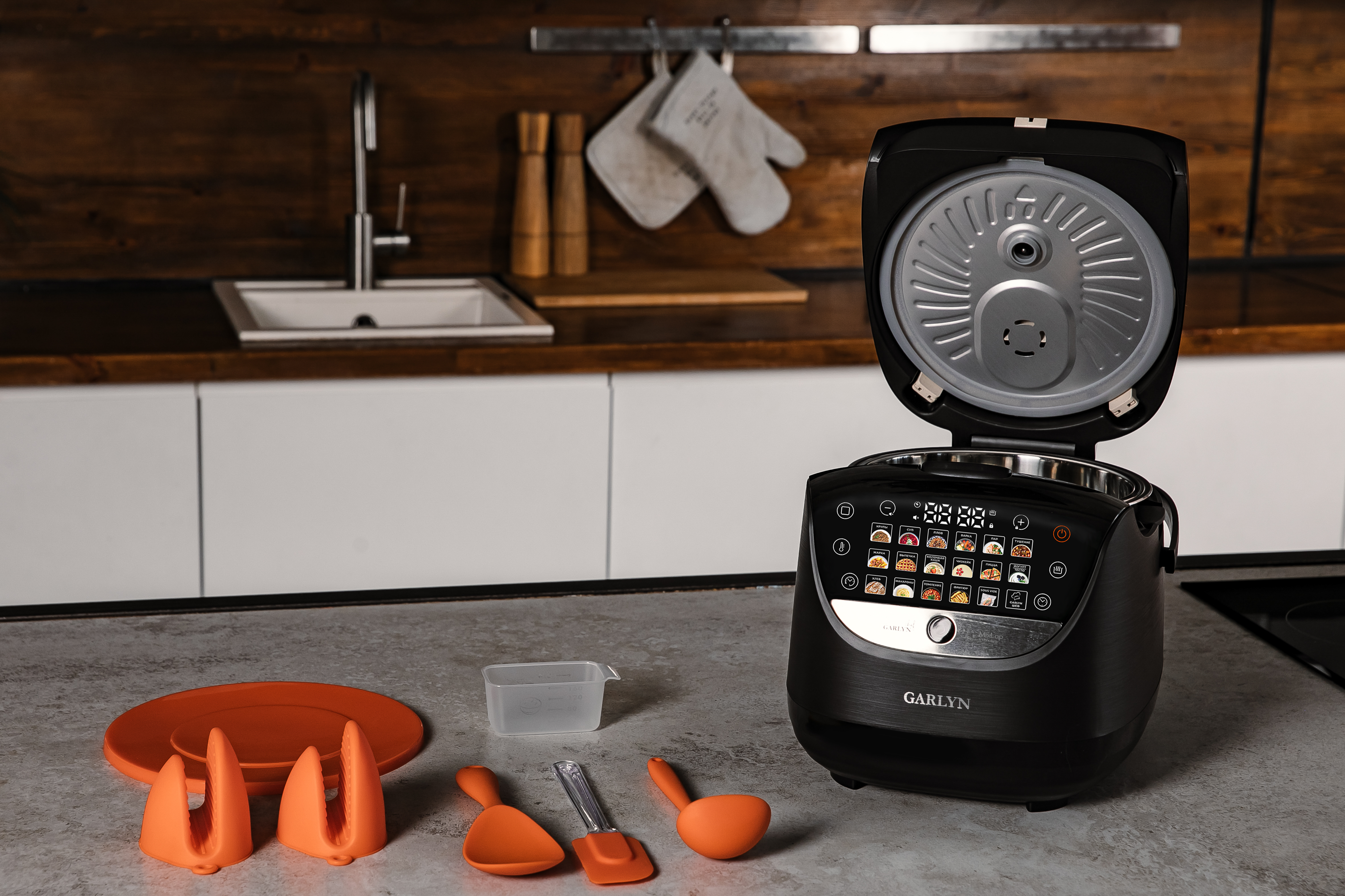Мультиварка - 1 шт.; Чаша - 1 шт.; Контейнер для приготовления на пару - 1 шт.; Черпак - 1 шт.; Мерный стакан - 1 шт.; Плоская силиконовая ложка - 1 шт.; Силиконовая лопатка - 1 шт.; Силиконовая крышка для чаши - 1 шт.; Комплект прихваток - 1 шт.; Электрошнур - 1 шт.; Руководство пользователя - 1 шт.; Краткая инструкция пользователя - 1 шт.