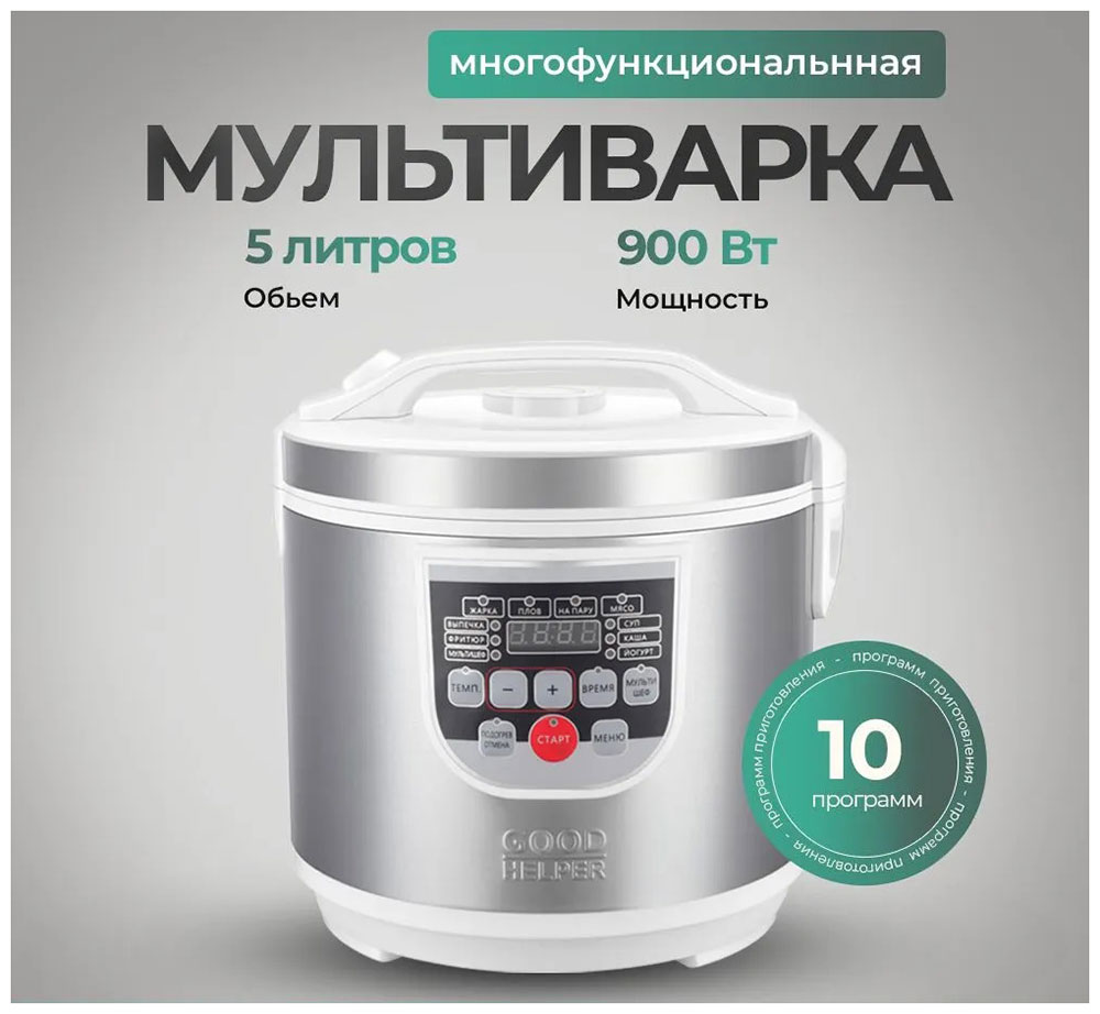 Программы приготовления: Варка, Жарка, Запекание, Мультиповар, Отложенный старт, Поддержание тепла, Подогрев, Выпечка, Десерт, Каша, Крупа, Манты, Молочная каша, Приготовление на пару, Пельмени, Пирог, Плов, Суп, Тесто, Разогрев, Тушение