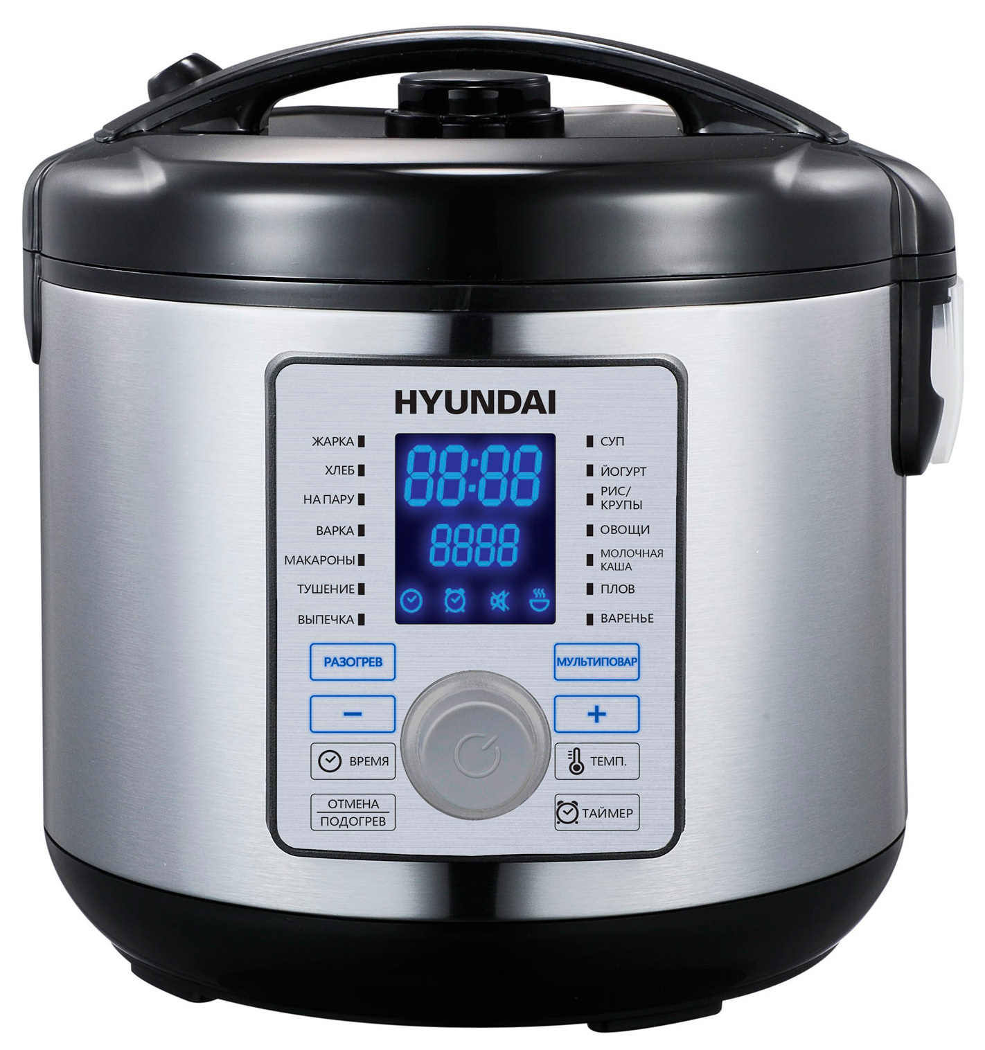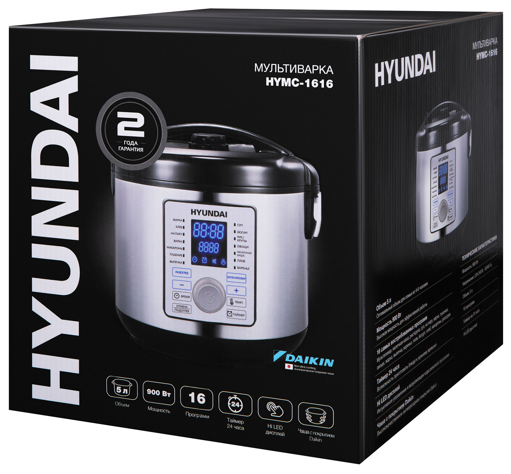 Мультиварка HYUNDAI HYMC-1616 является практически незаменимым кухонным инвентарем для каждой современной хозяйки. Такой бытовой прибор способен значительно упростить процесс приготовления пищи. Устройство выполнено в двух цветах: оптимально сочетаются серебристый и черный. На фронтальной части есть сенсорные клавиши управления и экран. Сверху имеется съёмный клапан для выхода пара и кнопка для открывания крышки. Мощность мультиварки составляет 900 Ватт, а объём используемой чаши равен 5 литрам. Здесь присутствует антипригарное покрытие, с помощью бытового прибора можно разогревать пищу или поддерживать ее температуру заданный промежуток времени.