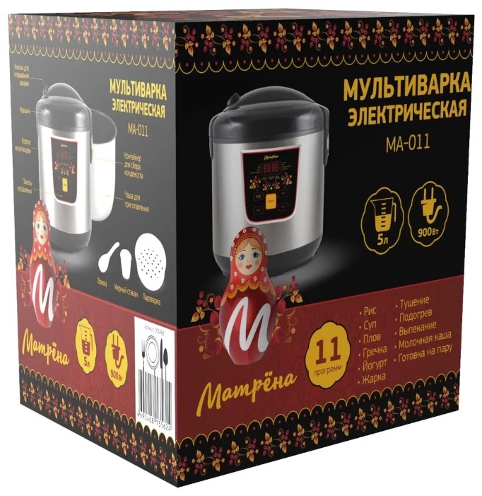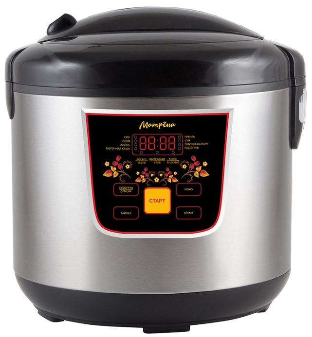 Эта мультиварка может послужить незаменимым кухонным прибором. Ведь устройство может и жарить, и варить, и запекать. И весь этот потенциал заключен в рамках компактного и легкого корпуса. Общая вместительность камеры нагрева составляет 5 л. Съемная чаша защищена антипригарным покрытием. Мощность нагрева — 900 Вт. Главным преимуществом аппарата является возможность термообработки без непосредственного участия пользователя. То есть повару не нужно помешивать консистенцию. Оптимальный уровень влажности и нагрева регулируется самим прибором, а покрытие чаши предотвращает пригорание. Мультиварка Matrena MA-011 имеет 11 программ автоприготовления. Прибор уверенно готовит любые первые и вторые блюда, а также закуски и выпечку. Функция отсрочки старта позволяет завершить приготовление перед самым приходом пользователя с работы. А если пользователь задержится дольше задуманного, то выручит функция подогрева. Блюдо гарантированно не остынет до положенного времени! Модель даст возможность готовить просто и со вкусом. Объема чаши хватит, чтобы обеспечить сытный рацион для 3-5 человек. Мультиварка позволяет готовить в 2 раза быстрее, чем при использовании стандартной кухонной плиты. Ведь камера нагрева распределяет тепло предельно равномерно, со всех сторон.