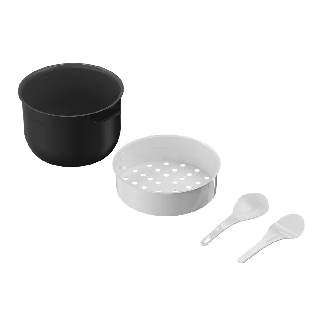 В комплекте с мультиваркой идёт столовая ложка, плоская ложка, мерная чашка, контейнер-пароварка, книга рецептов.
