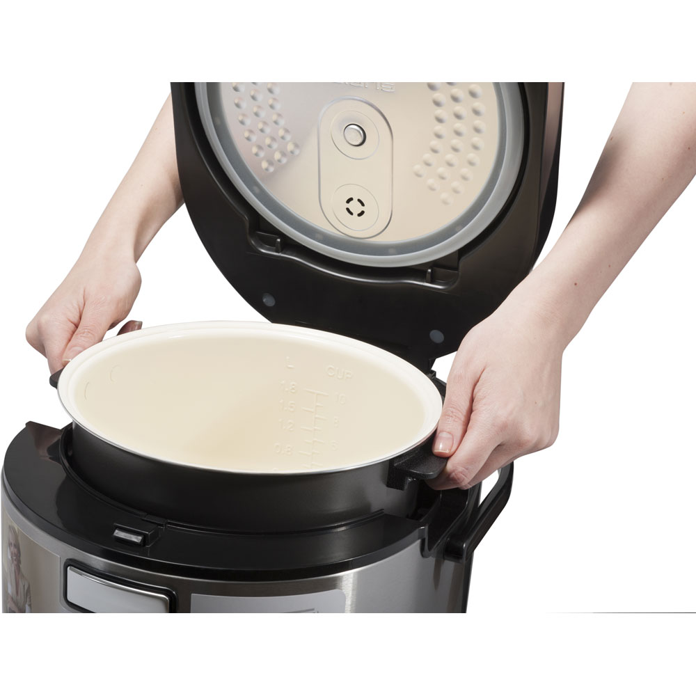Кроме того, мультиварка Polaris PMC 0523AD оснащена 23 автоматическими программами. В каждой из них предусмотрена функция «Отложенный старт» до 24 часов. Для приготовления пищи используется технология 3D-нагрева. Съемная 5-литровая чаша обладает антипригарным и антибактериальным керамическим покрытием. На чаше есть небольшие ручки, за которые можно безопасно достать горячую емкость и не обжечься. Мультиварка Polaris PMC 0523AD снабжена отменой автоподогрева, сенсорным управлением на крышке и трехцветной подсветкой экрана, которая меняется при работе прибора. К мультиварке Polaris PMC 0523AD прилагается стандартный набор аксессуаров и йогуртницы
