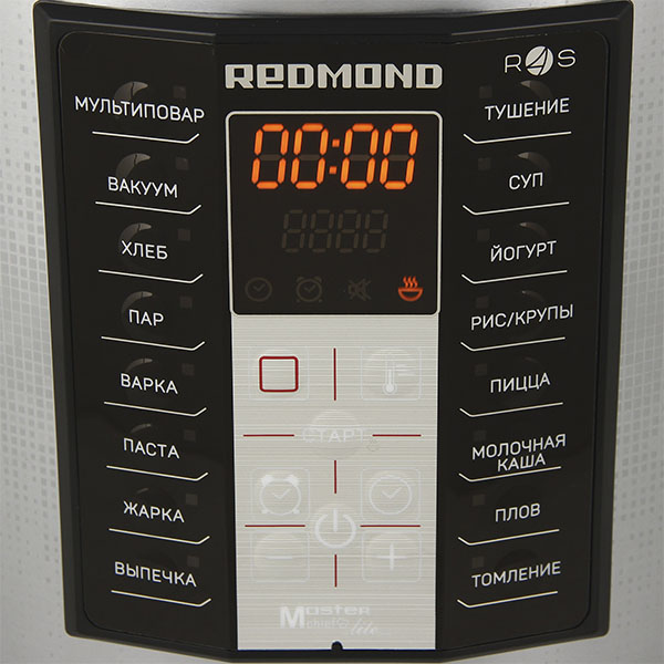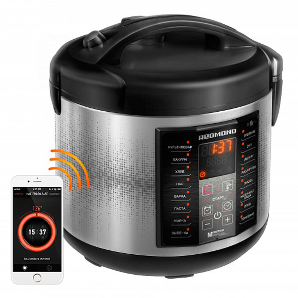 Redmond RMC-M40S – умная мультиварка, которой можно управлять на расстоянии, используя смартфон или планшет. На мобильное устройство при этом нужно установить бесплатное приложение Ready for Sky. Информацию о выбранном режиме работы или времени, оставшемся до конца приготовления, можно в любой момент просмотреть на ярком дисплее.