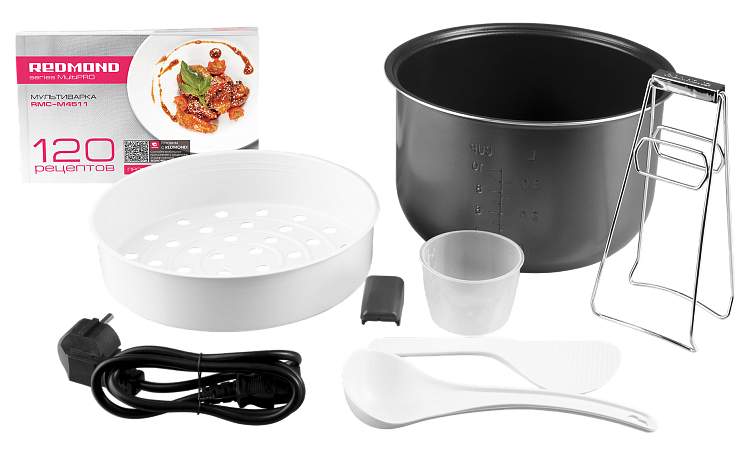 чаша; корзина для приготовления на пару; мерный стакан; плоская ложка; книга рецептов