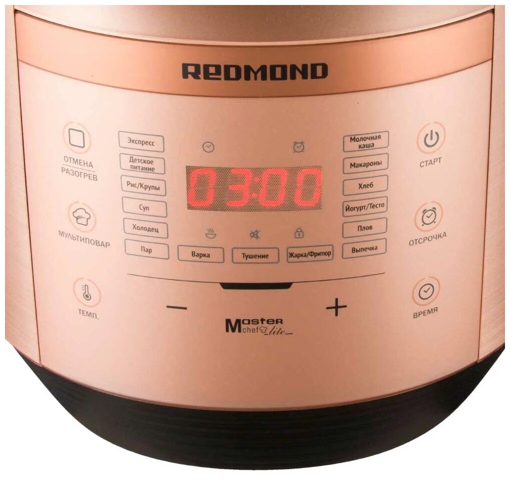 16 автоматических программ и 29 программ ручной настройки; полезный объем чаши - 3.15 л; автоподогрев до 12 часов; длина шнура электропитания - 1м; совместимая чаша - REDMOND RB-A432