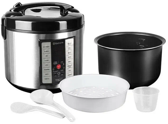 мерный стаканчик, черпак и ложка, контейнер для приготовления на пару