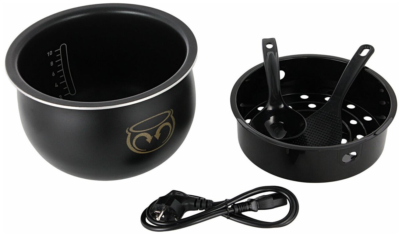 мультиварка, паровая корзина, съемная чаша, мерный стакан, ложка для риса, ложка для супа, шнур питания, инструкция, книга рецептов
