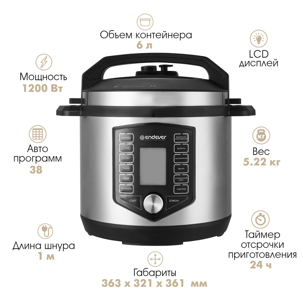 38 автоматических программ, LCD-дисплей, Функция отложенного старта до 24 часов, Автоподогрев до 24 часов, Корпус из нержавеющей стали, 3 режима регулировки уровня давления, Защита от перегрева, Программа СУ-ВИД