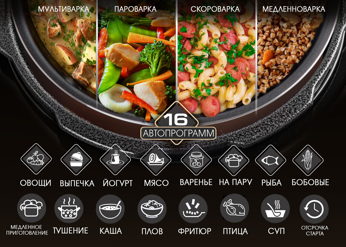 Наша скороварка оснащена 16 автоматическими программами, которые позволят вам приготовить любимые блюда всего в несколько простых шагов. Удобный LED дисплей поможет вам легко выбрать нужную программу и контролировать процесс готовки.
