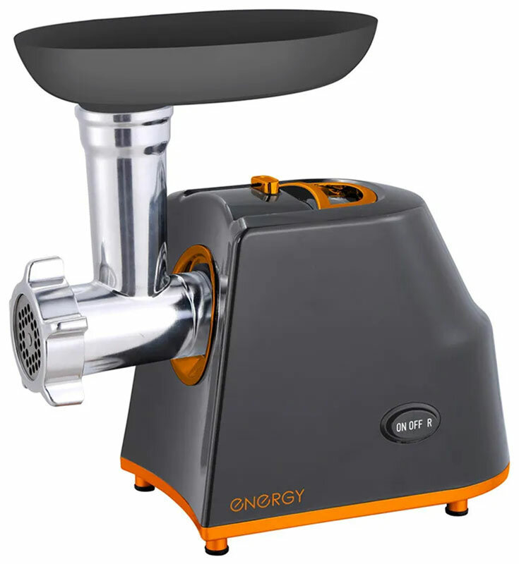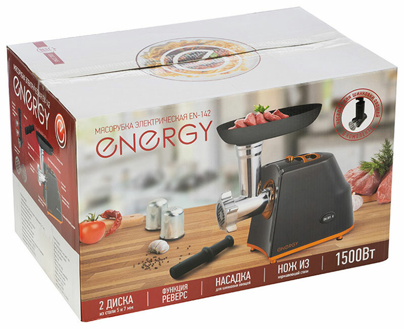 Электромясорубка Energy EN-142 с функцией обратного хода, ножами из нержавеющей стали и специальной насадкой для шинковки овощей.
